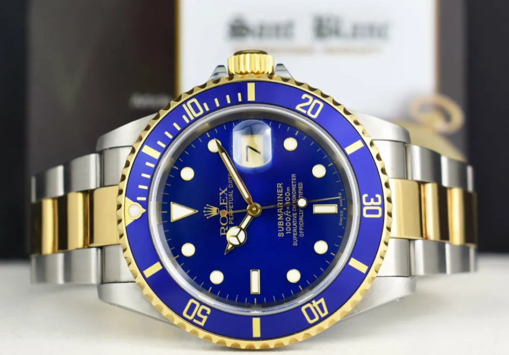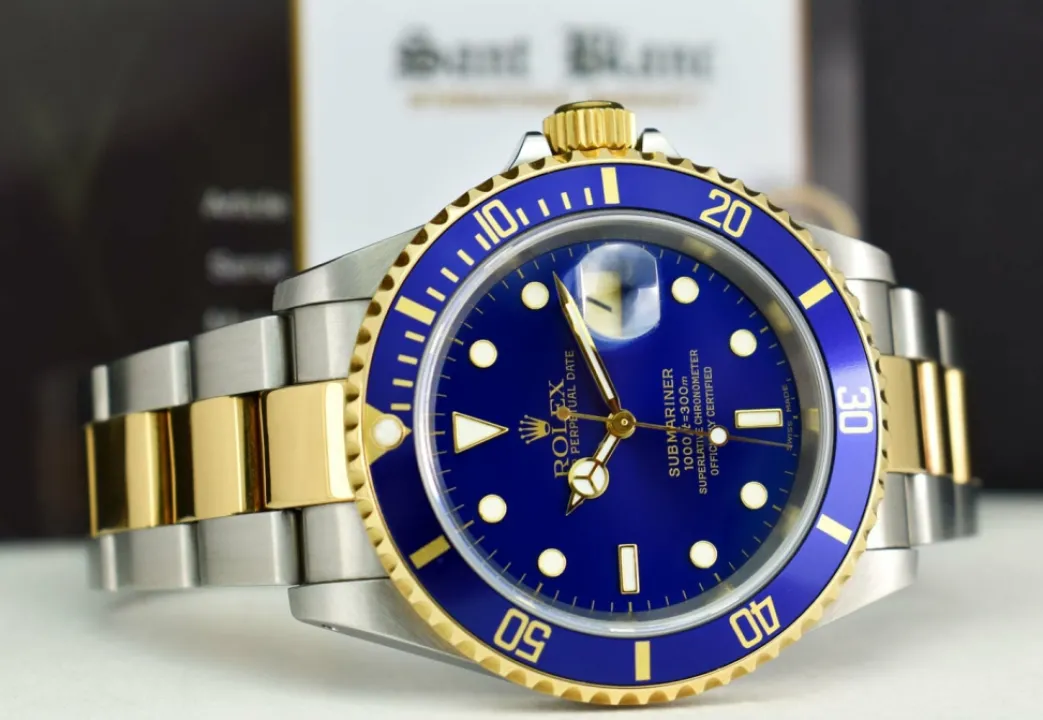 ROLEX BOX BOOKS & PAPERS – Comes with Original Rolex Box, Books, & Factory Rolex Papers! Absolutely Stunning brilliant Rolex Blue Index Dial! This is the 40mm size 18kt Yellow Gold & Stainless Steel Rolex Submariner model 16613: This is the style with the Rolex 18kt Gold & Stainless bracelet. This Rolex is in pristine condition…Priced to sell immediately!