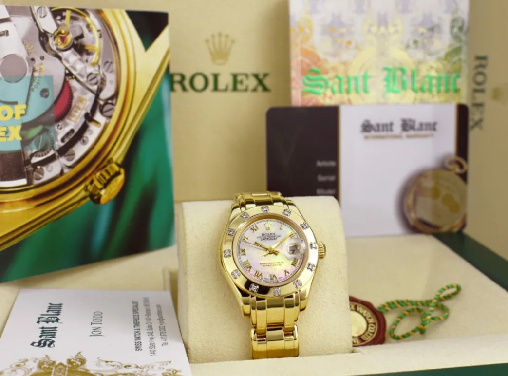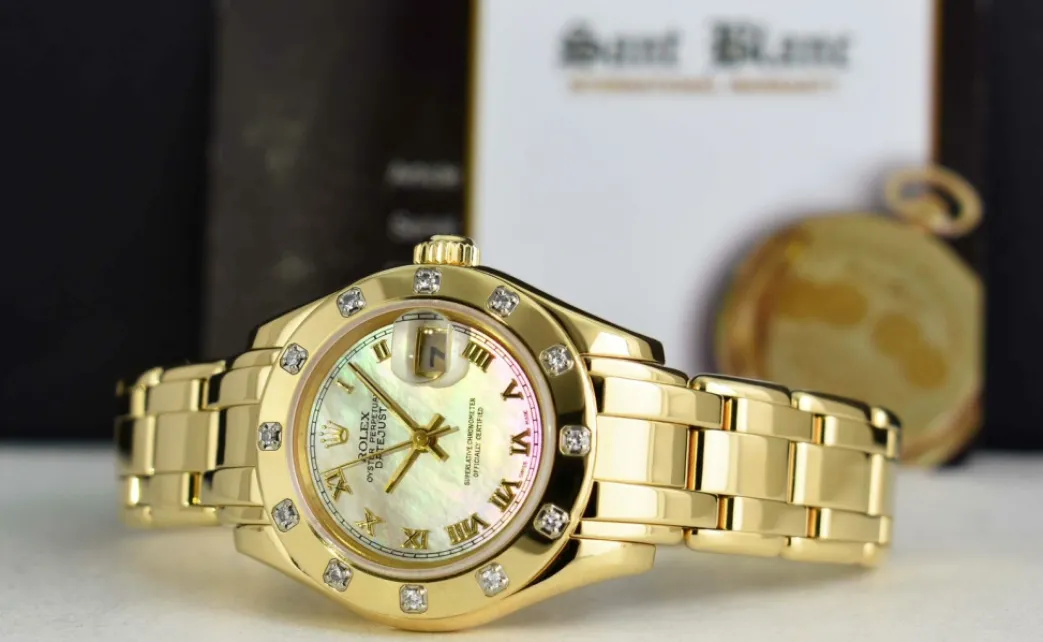 Absolutely Stunning brilliant Rolex Mother of Pearl Roman Dial! This is the 29mm size 18kt Yellow Gold Rolex Ladies Datejust Pearlmaster – Rolex model 69318: This is the style with the Rolex 18kt Gold bracelet. This Rolex is in pristine condition…Priced to sell immediately!