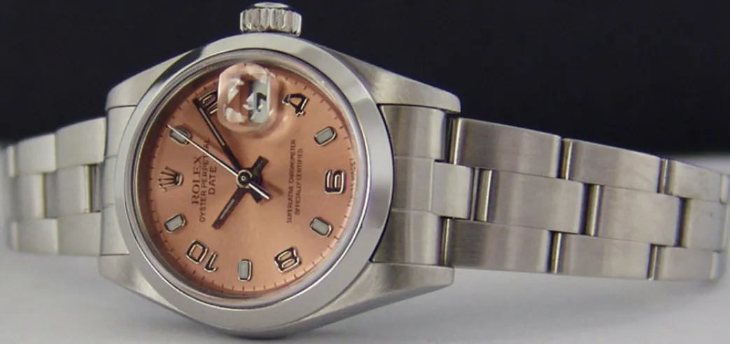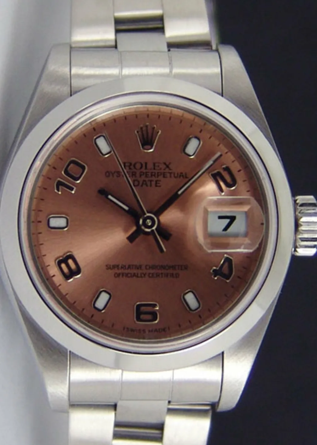 Absolutely Stunning brilliant Rolex Rose Arabic Dial! This is the Ladies 26mm size Stainless Steel Rolex Datejust model 79160: This is the style with the Rolex Stainless Oyster bracelet. This Rolex is in pristine condition…Priced to sell immediately!