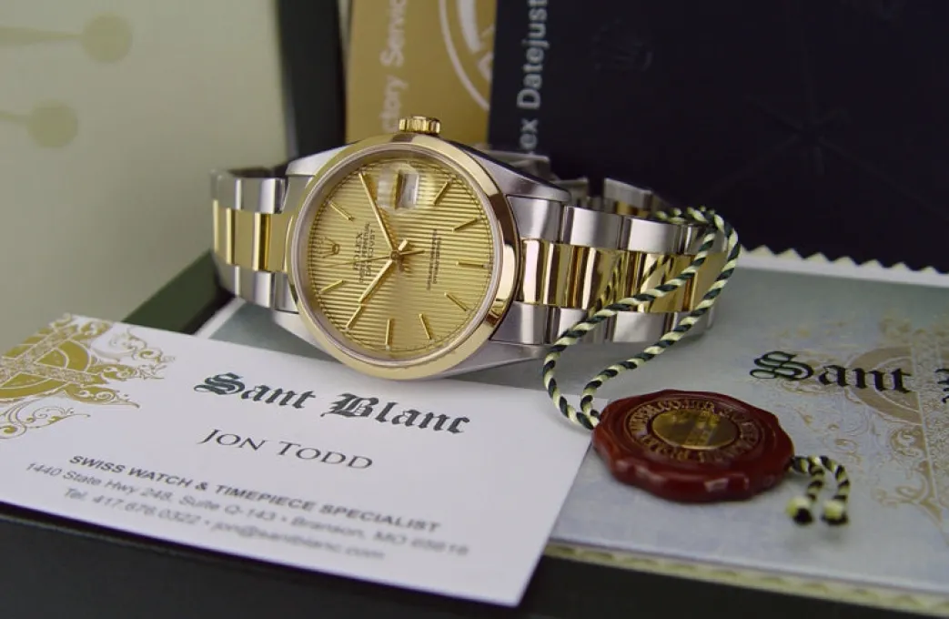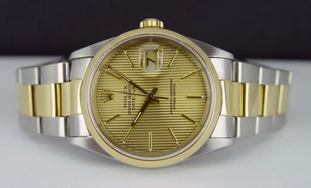 Absolutely Stunning brilliant Rolex Champagne Tapestry Stick Dial! This is the 36mm size 18kt Yellow Gold & Stainless Steel Rolex Datejust model 16203: This is the style with the Rolex 18kt Gold & Stainless bracelet. To replace this Rolex has an estimated MSRP of $10,300. This Rolex is in pristine condition…Priced to sell immediately!