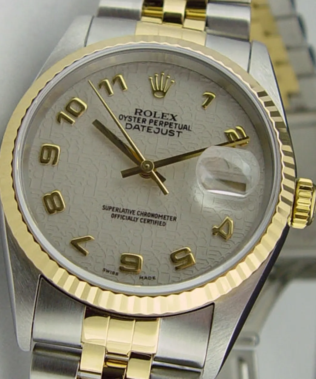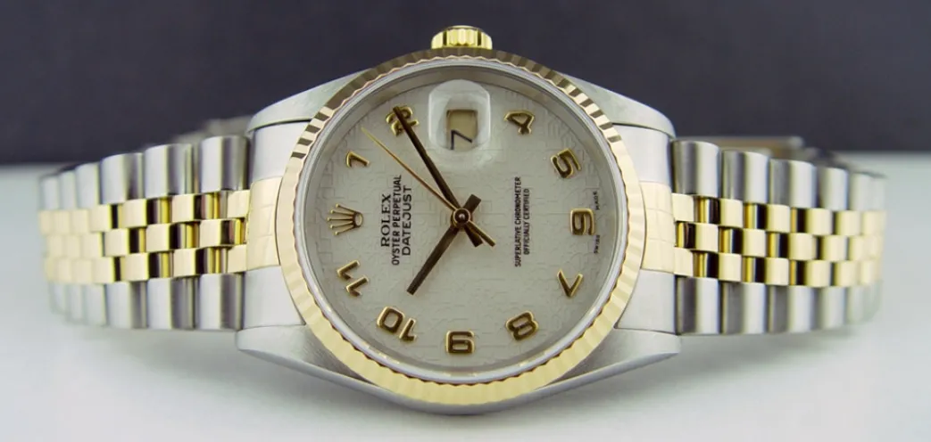 Absolutely Stunning brilliant Rolex Ivory Jubilee Arabic Dial! This is the 36mm size 18kt Yellow Gold & Stainless Steel Rolex Datejust model 16233: This is the style with the Rolex 18kt Gold & Stainless bracelet. To replace this Rolex has an estimated MSRP of $11,800. This Rolex is in pristine condition…Priced to sell immediately!
