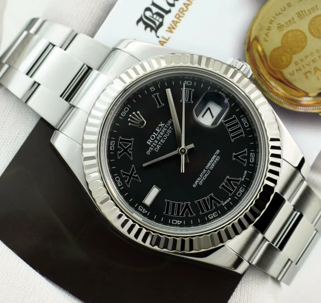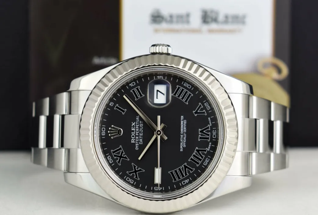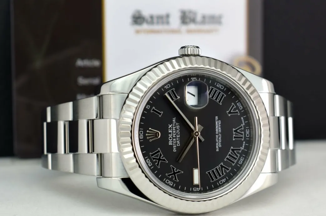 Absolutely Stunning brilliant Rolex Black Roman Dial! This is the 41mm size 18kt White Gold & Stainless Steel Rolex Datejust II model 116334: This is the style with the Rolex Stainless Steel Oyster bracelet. This Rolex is in pristine condition…Priced to sell immediately!