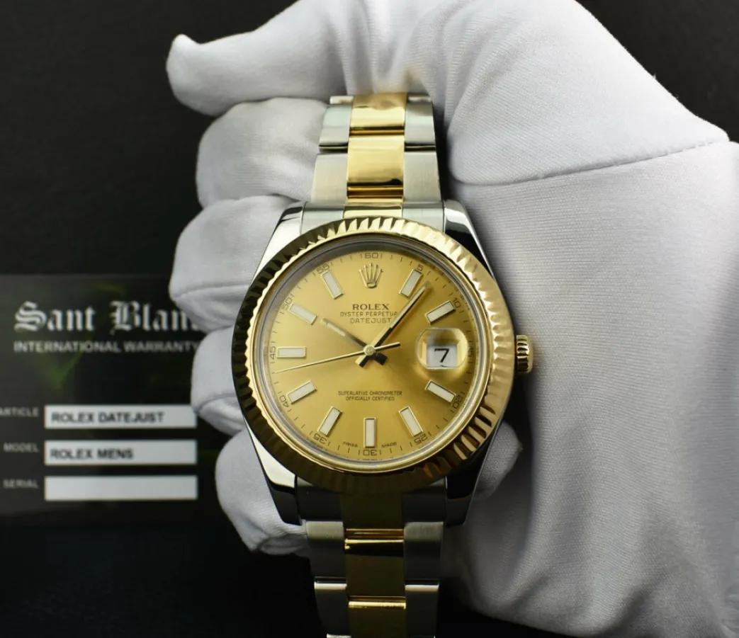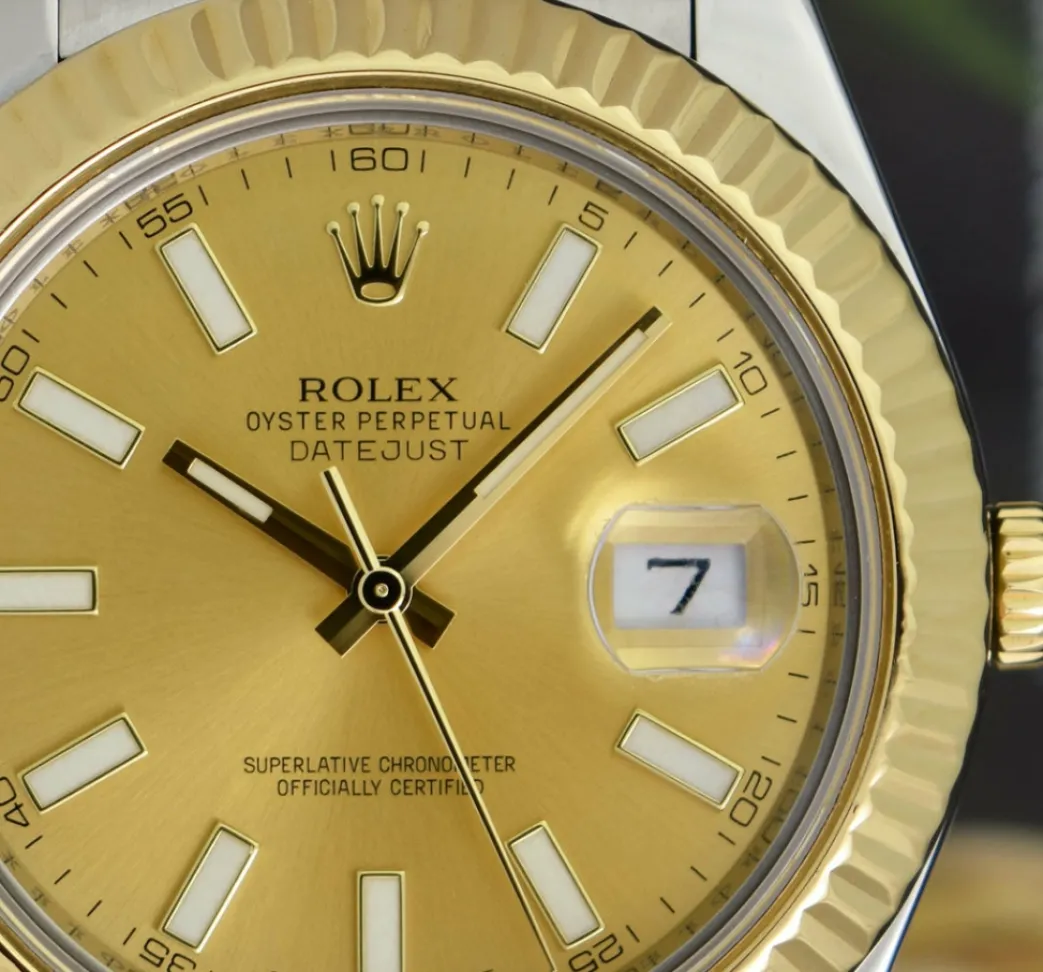Absolutely Stunning brilliant Rolex Champagne Index Dial! This is the 41mm 18kt Yellow Gold & Stainless Steel Rolex Datejust II model 116333: This is the style with the Rolex Stainless Steel Oyster bracelet. This Rolex is in pristine condition…Priced to sell immediately!