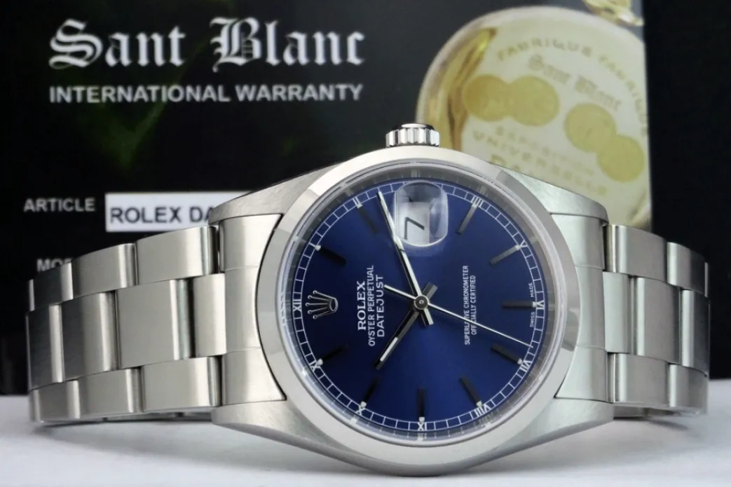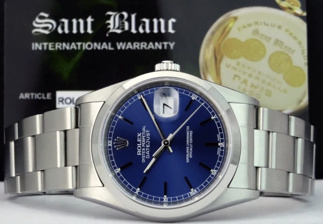 Absolutely Stunning brilliant Blue Stick Dial! This is the 36mm size Stainless Steel Rolex Datejust model 16200: This is the style with the Rolex Stainless Steel bracelet. This Rolex is in pristine condition…Priced to sell immediately!