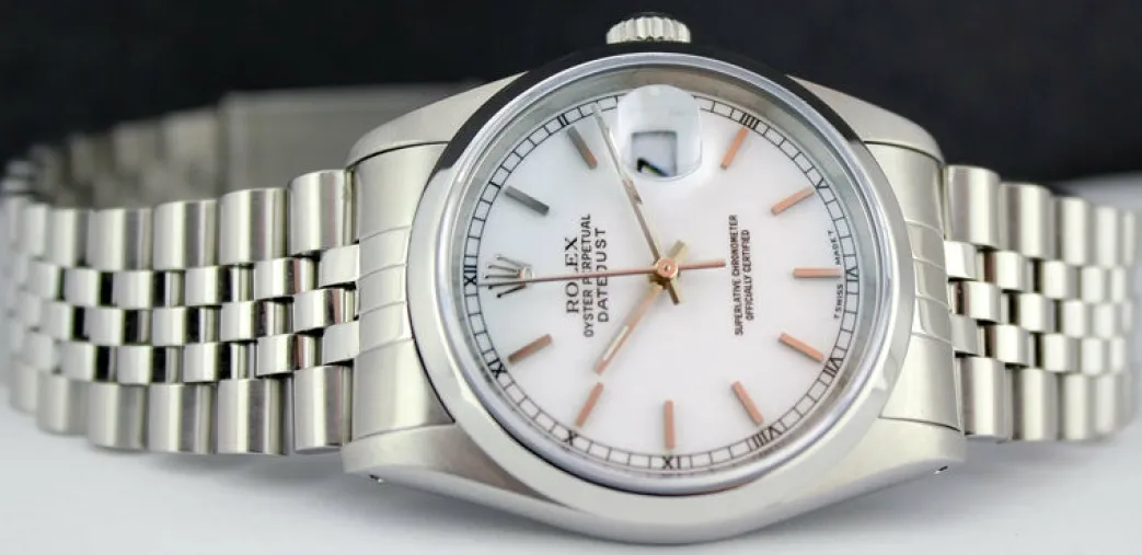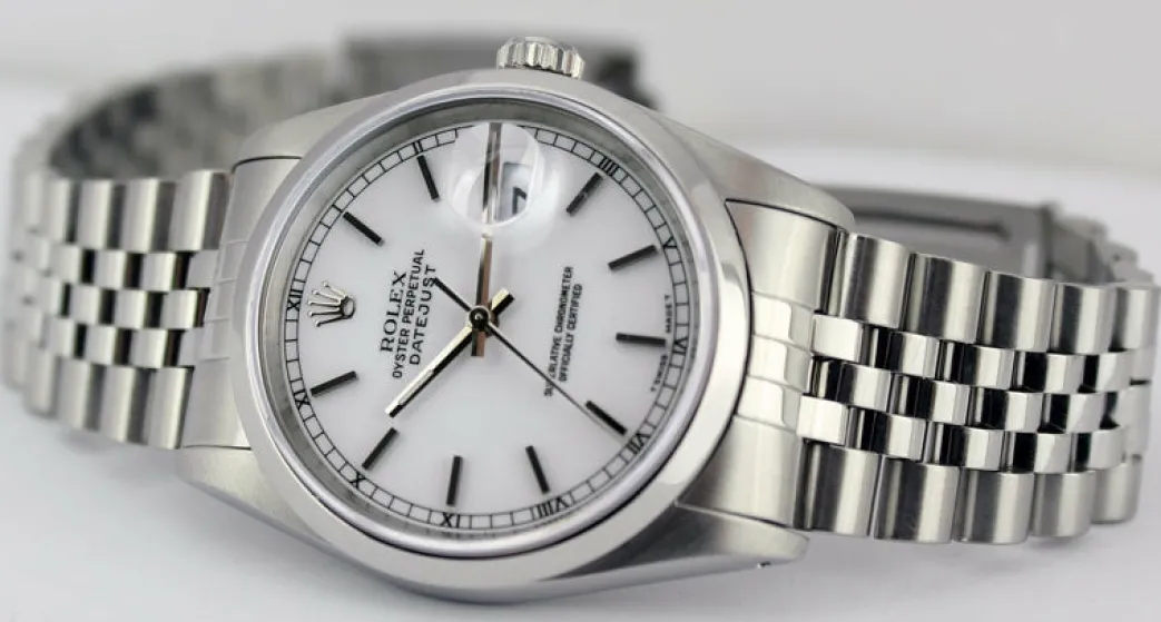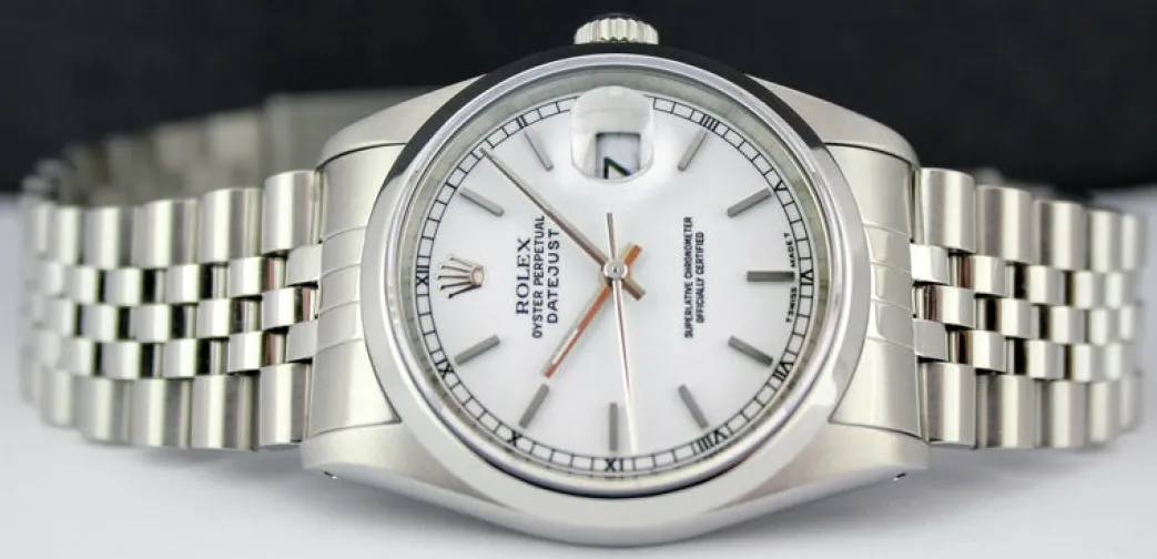Absolutely Stunning brilliant White Stick Dial! This is the 36mm size Stainless Steel Rolex Datejust model 16200: This is the style with the Rolex Stainless Steel bracelet. This Rolex is in pristine condition…Priced to sell immediately!