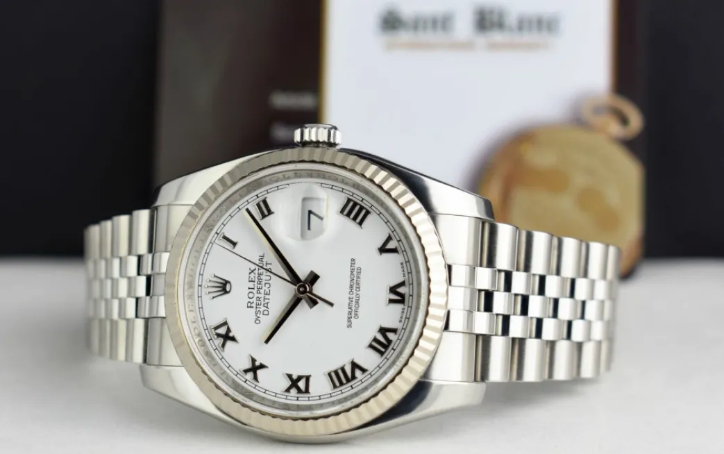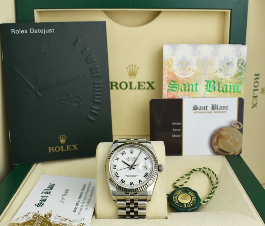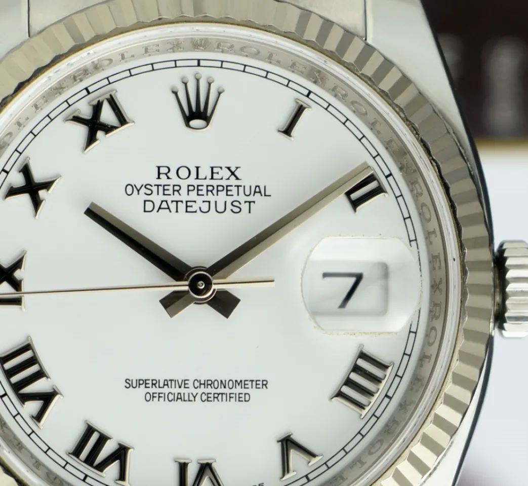 ROLEX REHAUT – This Datejust 116234 is a later model with the Inner Bezel Engraving! Absolutely Stunning brilliant Rolex White Roman Dial! This is the 36mm size 18kt White Gold & Stainless Steel Rolex DateJust model 116234: This is the style with the Rolex Stainless Steel bracelet. This Rolex is in pristine condition…Priced to sell immediately!