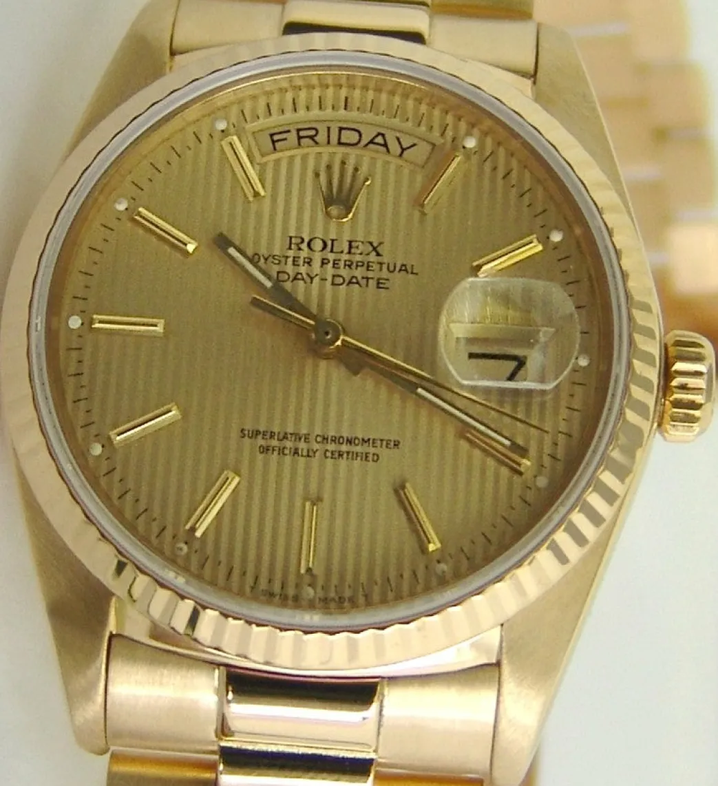 Absolutely stunning! Brilliant Rolex Champagne Tapestry Stick Dial! This is the Rolex 36mm Day-Date President model: This is the style with the Rolex 18kt Yellow Gold President bracelet. This Rolex is in pristine condition…Priced to sell immediately!