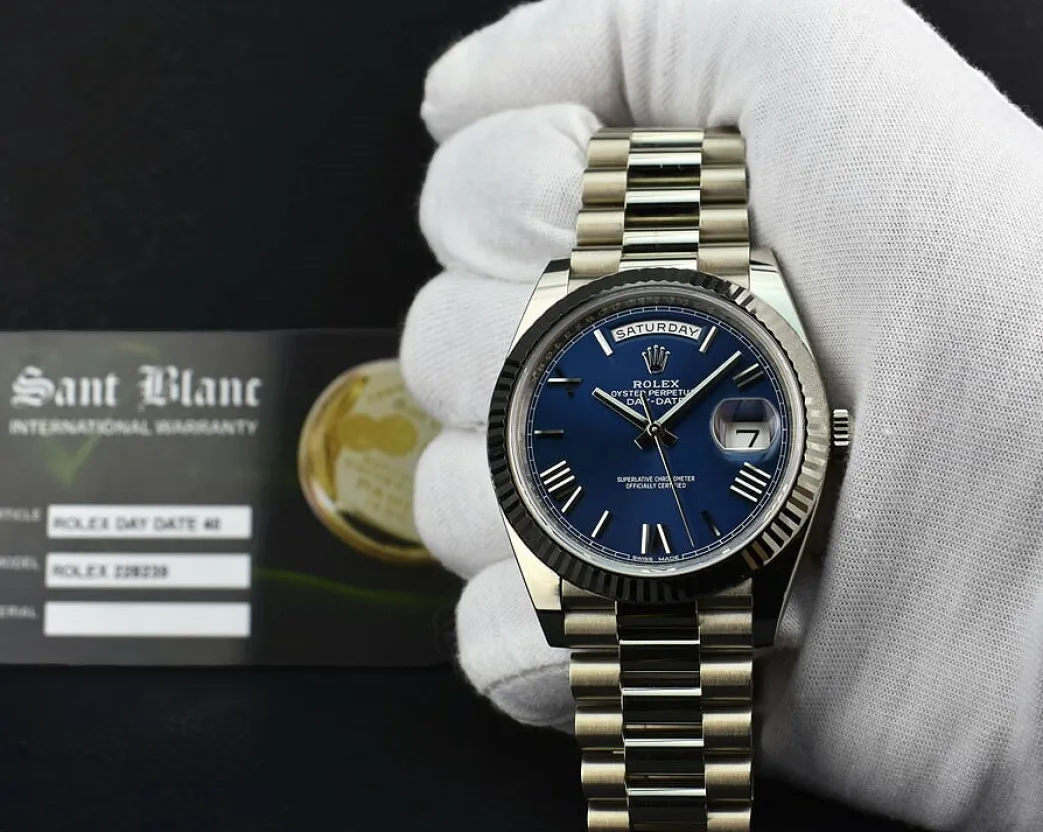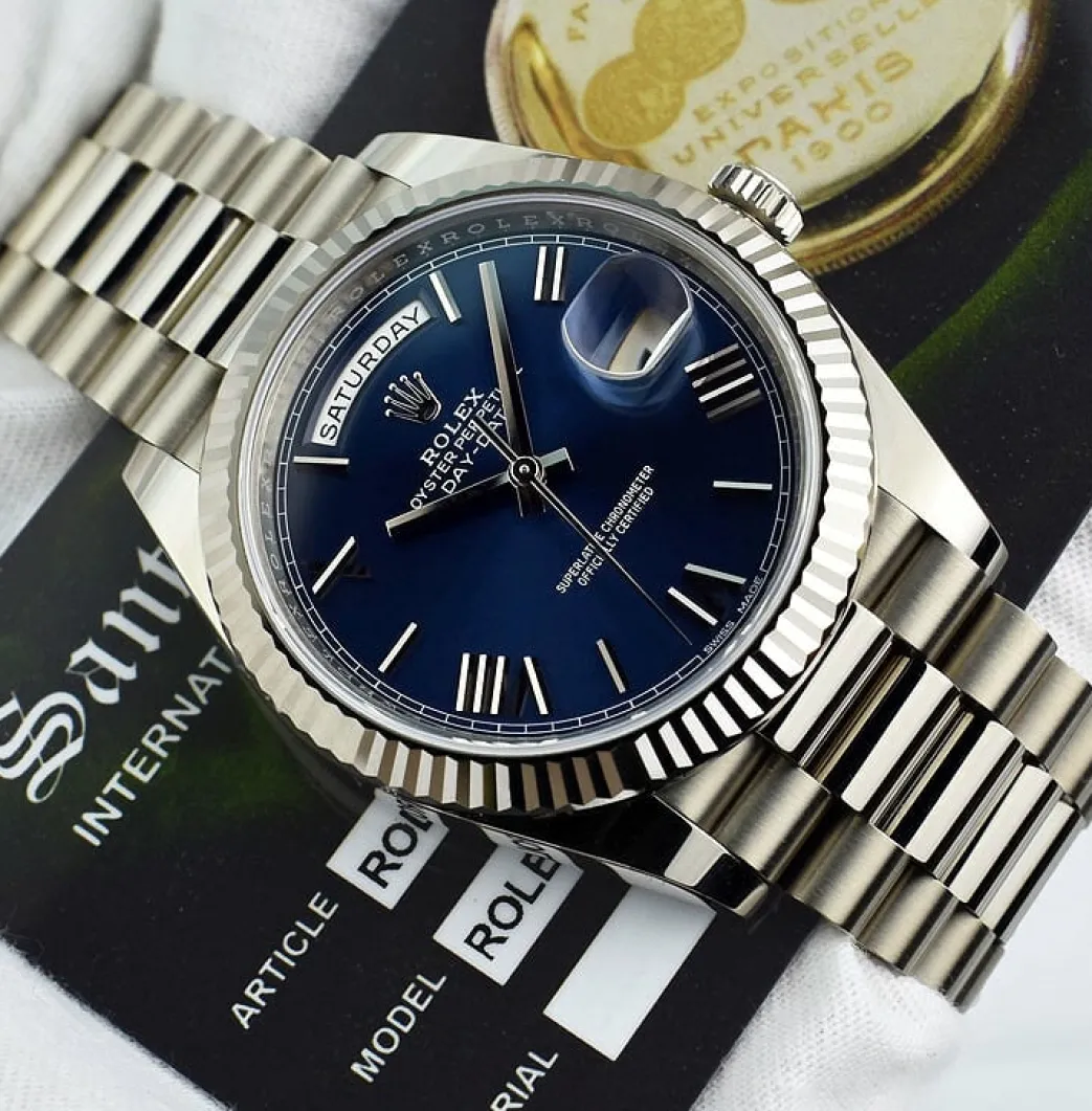 Absolutely Stunning brilliant Rolex Blue Roman Dial! This is the 40mm size 18kt White Gold Day Date 40 President: This is the style with the Rolex 18kt White Gold bracelet. To replace this Rolex has an estimated MSRP of $37,550. This Rolex is in pristine condition…Priced to sell immediately!
