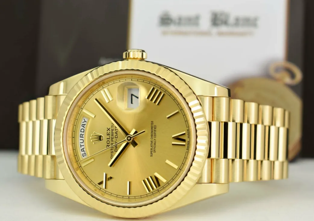 Absolutely Stunning brilliant Rolex Champagne Roman Dial! This is the 40mm size 18kt Gold Rolex Day Date model 228238: This is the style with the Rolex 18kt Gold President bracelet. To replace this Rolex has an estimated MSRP of $36,550. This Rolex is in pristine condition…Priced to sell immediately!