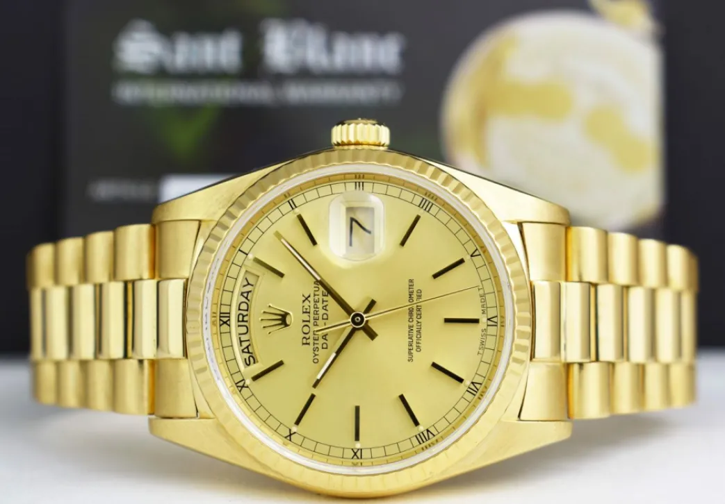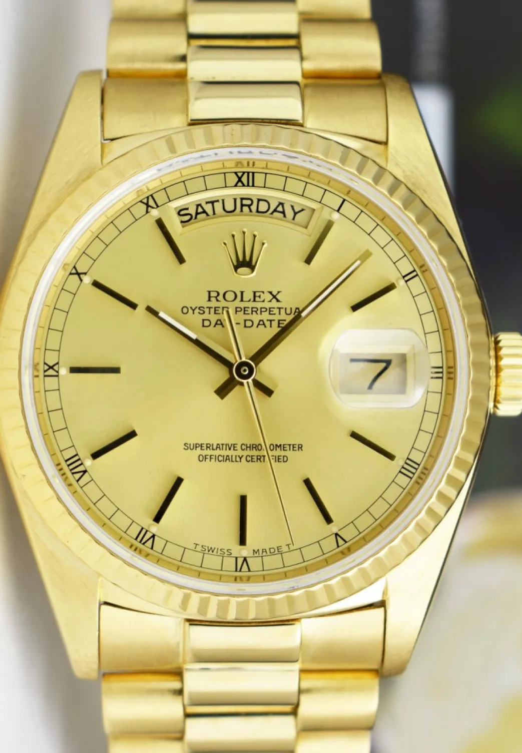 Men’s Watches | President Dress Watches | Sant Blanc ROLEX 36mm 18kt Gold Day Date President Champagne Stick Dial Model 18038