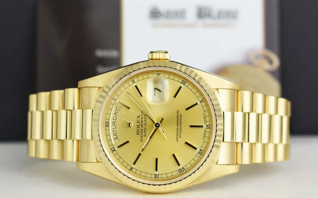 Absolutely Stunning brilliant Rolex Champagne Stick Dial! This is the 36mm size Rolex Day-Date President model 18238: This is the style with the Rolex 18kt Gold bracelet.This Rolex is in pristine condition…Priced to sell immediately!