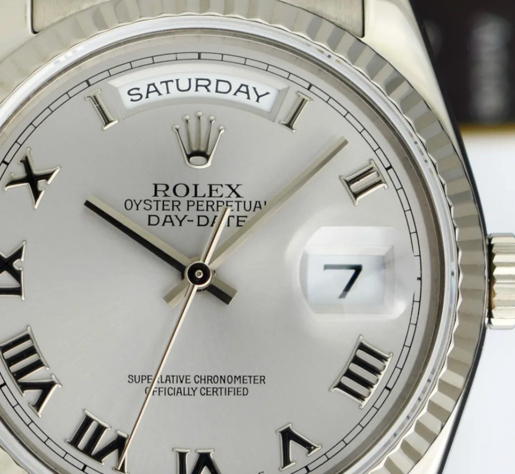 ROLEX – Absolutely Stunning brilliant Rolex Silver Roman Dial and Factory Fluted Bezel! This is the 36mm size 18kt White Gold Rolex Day-Date 36 model 118239: This is the style with the Rolex 18kt White Gold President bracelet. This Rolex is in pristine condition…Priced to sell immediately!