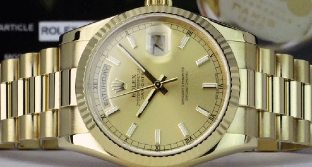 Absolutely Stunning brilliant Rolex Champagne Index Dial! This is the 36mm size 18kt Gold Rolex Day-Date model 118238: This is the style with the Rolex 18kt Gold President bracelet. To replace this Rolex has an estimated MSRP of $31,350. This Rolex is in pristine condition…Priced to sell immediately!