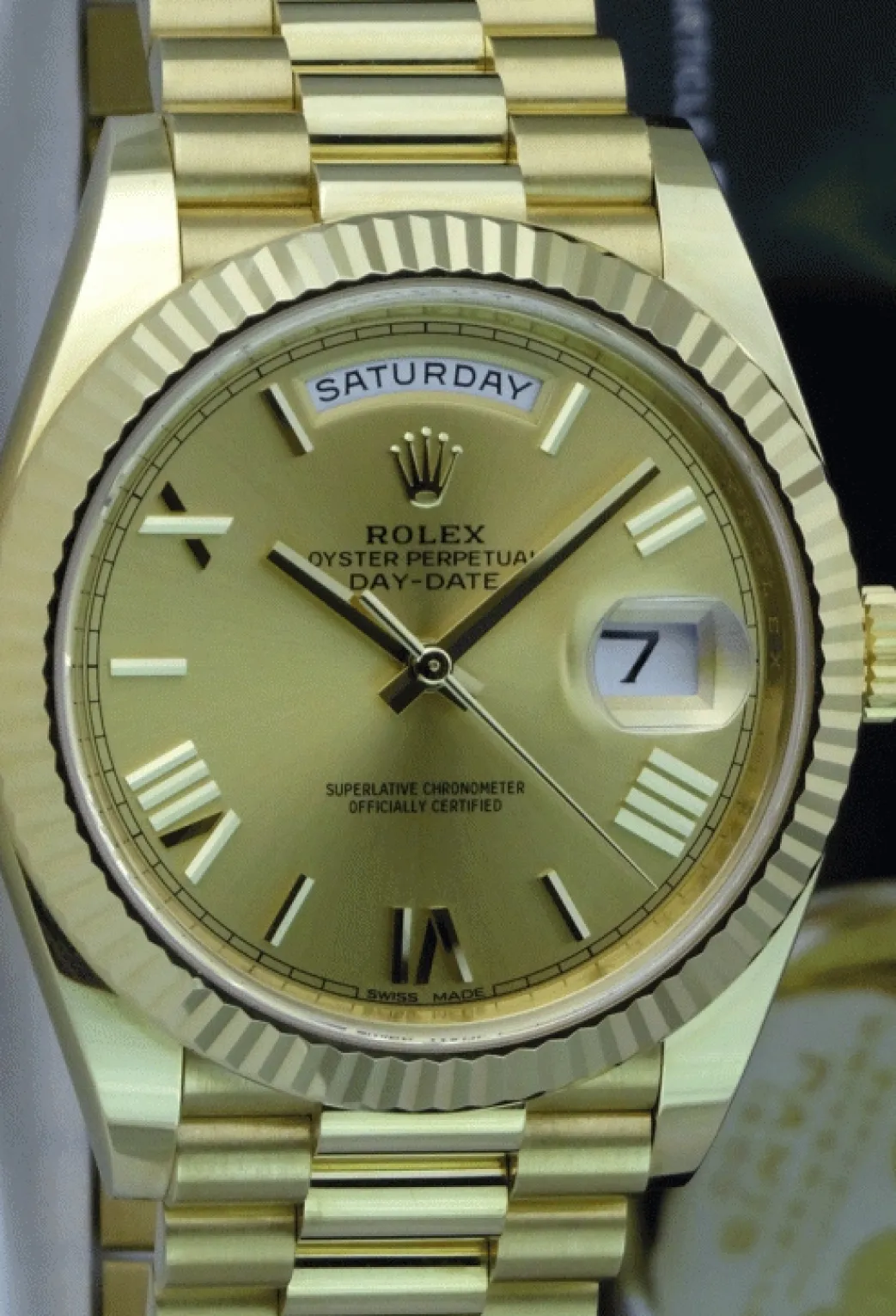 Absolutely Stunning brilliant Rolex Champagne Roman Dial! This is the 40mm size 18kt Gold Rolex Day Date model 228238: This is the style with the Rolex 18kt Gold President bracelet. To replace this Rolex has an estimated MSRP of $34,850. This Rolex is in pristine condition…Priced to sell immediately!