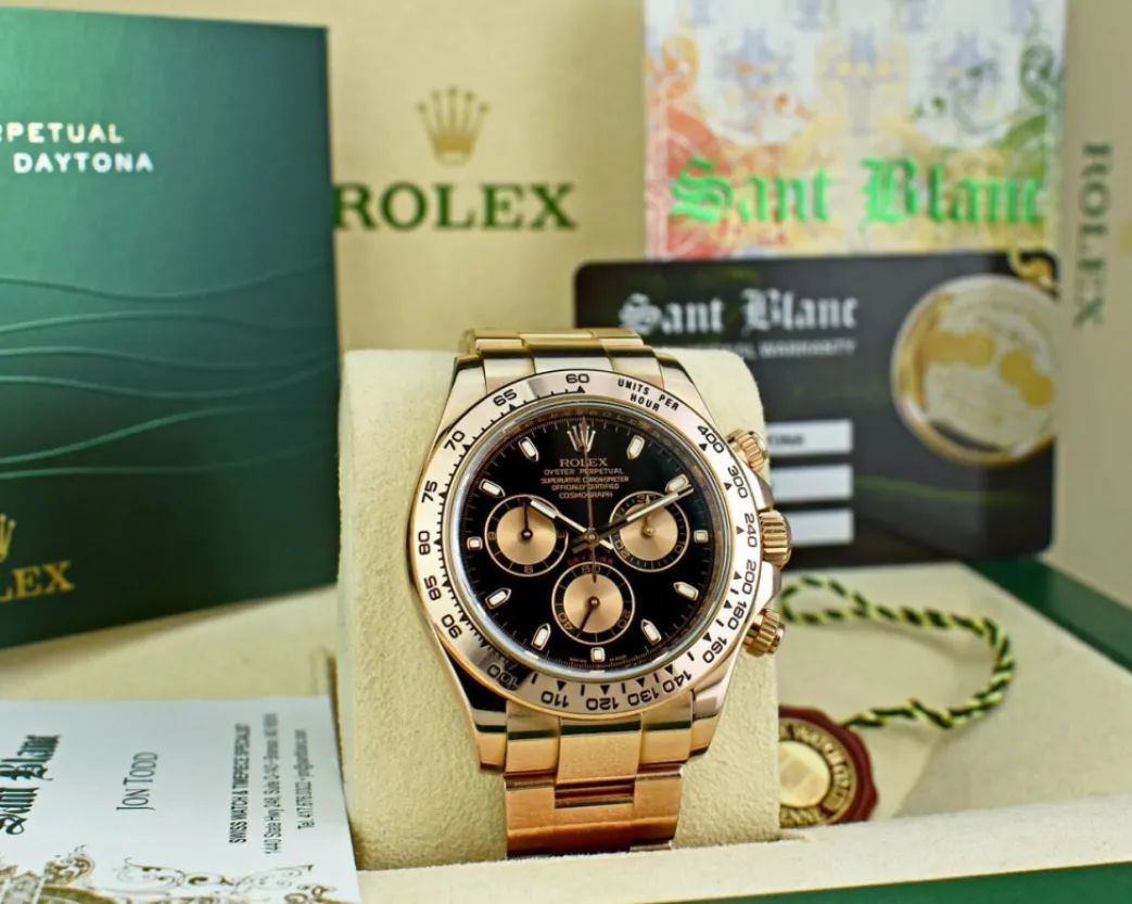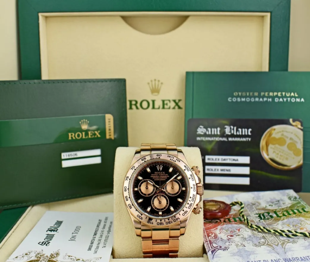 ROLEX BOX BOOKS & CARD – Comes with Rolex Factory Box, Books! Absolutely Stunning brilliant Rolex Black Index Dial! This is the 40mm size 18kt Rose Gold Rolex Daytona model 116505: This is the style with the Rolex Rose Gold bracelet. This Rolex is in pristine condition…Priced to sell immediately!