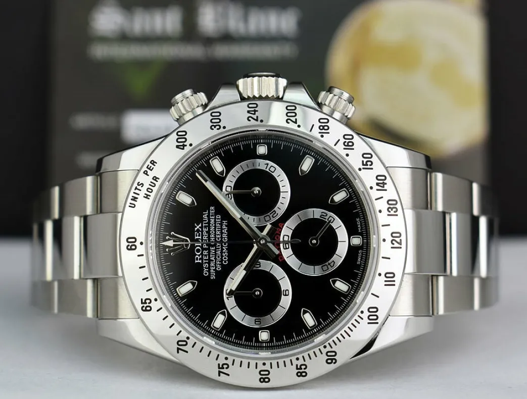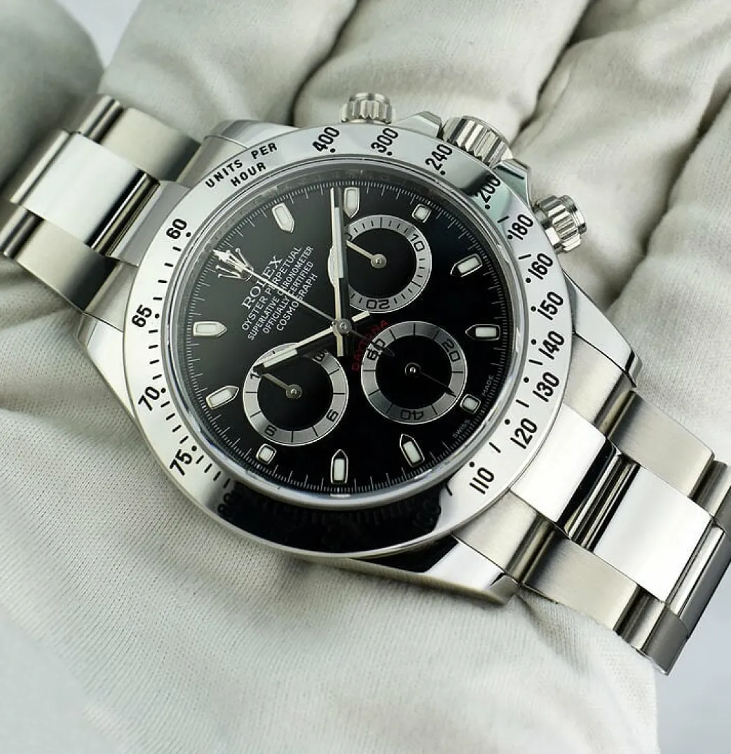 ROLEX BOX BOOKS & CARD – Comes with Original Rolex Box, Books, & Factory Rolex Card! This Daytona is a later model with the Newer “Fat” Buckle! Absolutely Stunning brilliant Rolex Factory Black Dial! This is the 40mm size Stainless Steel Rolex Daytona model 116520: This is the style with the Rolex Stainless Steel bracelet. This Rolex is in pristine condition…Priced to sell immediately!