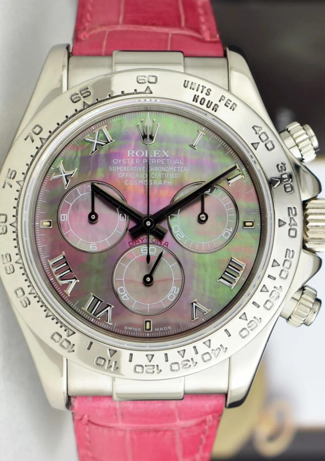 Men’s Watches | Racing Professional Watches | Sant Blanc ROLEX 40mm White Gold Daytona Tahitian Mother of Pearl Roman Pink Strap Model 116519