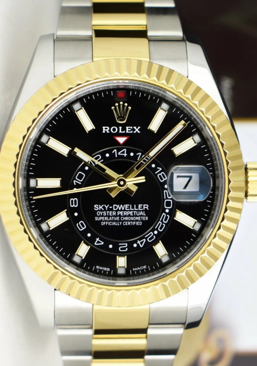 ROLEX BOX BOOKS & CARD – Comes with Original Rolex Box, Books, & Factory Rolex Card! Absolutely stunning brilliant Rolex Factory Black Index Dial! This is the 42mm size Rolex 18kt Gold and Stainless Steel Sky Dweller model 326933. This is the style with the Rolex 18kt Gold & Stainless Oyster bracelet. This Rolex is in pristine condition and priced to sell immediately! Comes with genuine Rolex presentation boxes, Rolex books, Rolex tag, Retail Appraisal and The Sant Blanc Three Year Warranty!…In pristine condition…The Perfect Gift!
