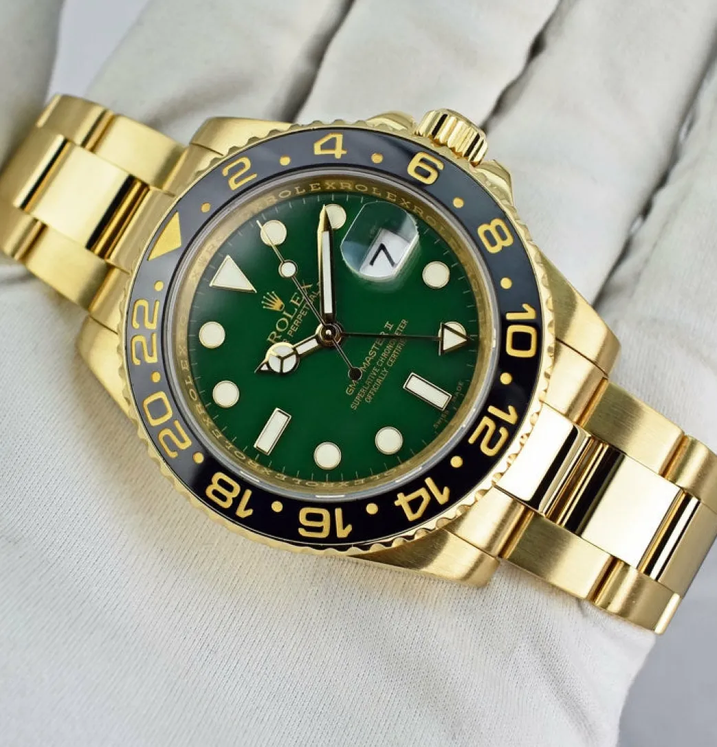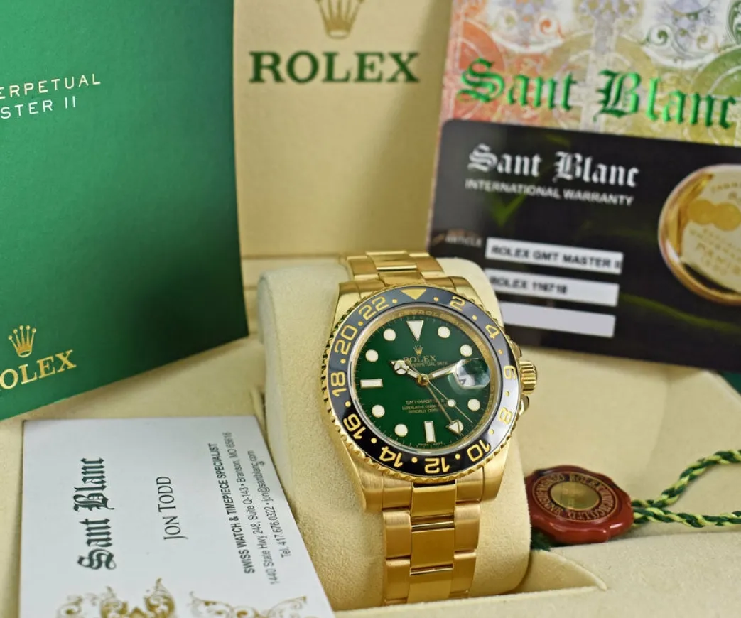 Absolutely Stunning brilliant Rolex Green Index Dial! This is the 40mm 18kt Yellow Gold Rolex GMT-Master II model 116718: This is the style with the Rolex 18kt Gold Oyster bracelet. To replace this Rolex has an estimated MSRP of $33,250. This Rolex is in pristine condition…Priced to sell immediately!