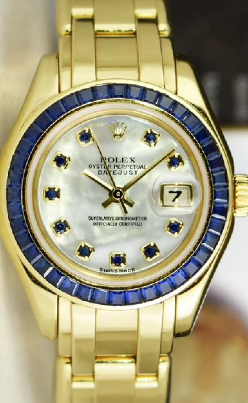 Absolutely Stunning brilliant Rolex Mother of Pearl Sapphire Dial and Factory Sapphire Bezel! This is the 29mm size 18kt Yellow Gold Rolex Ladies Datejust Pearlmaster – Rolex model 80308: This is the style with the Rolex 18kt Yellow Gold bracelet. This Rolex is in pristine condition…Priced to sell immediately!