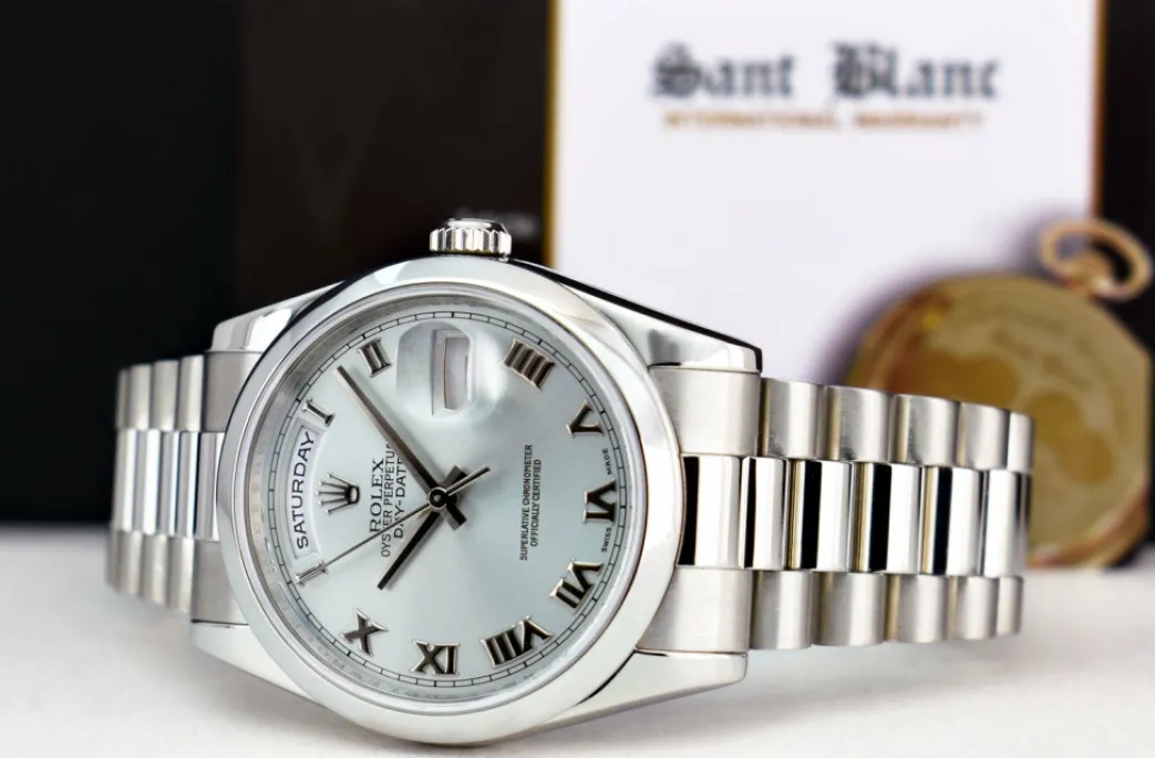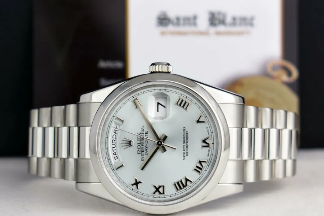 ROLEX REHAUT – This Day Date is a later model with Inner Bezel Engraving (Rehaut)! Absolutely Stunning brilliant Rolex Light Silver Rhodium Roman Dial! This is the 36mm size Platinum Rolex Day Date President model 118206: This is the style with the Rolex Platinum bracelet. To replace this Rolex has an estimated MSRP of $57,600. This Rolex is in pristine condition…Priced to sell immediately!