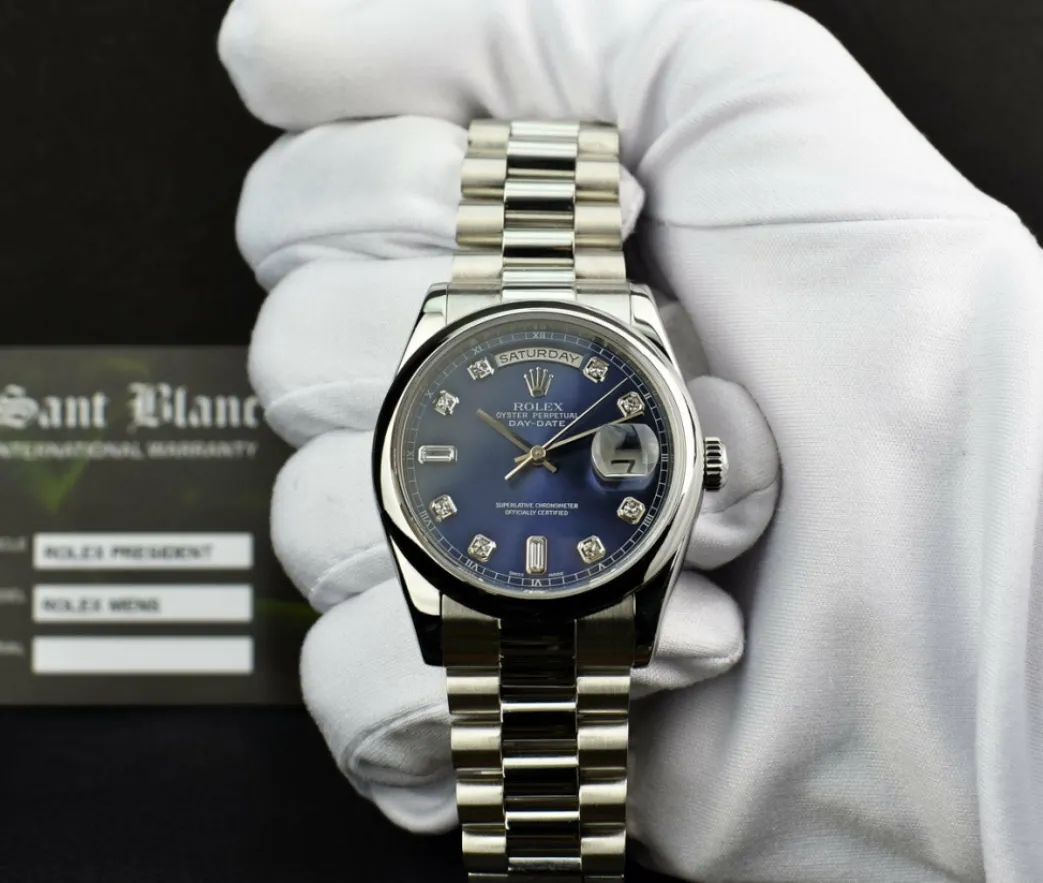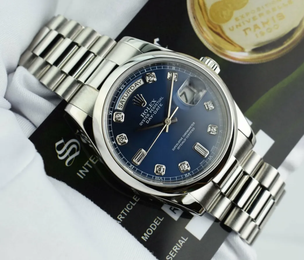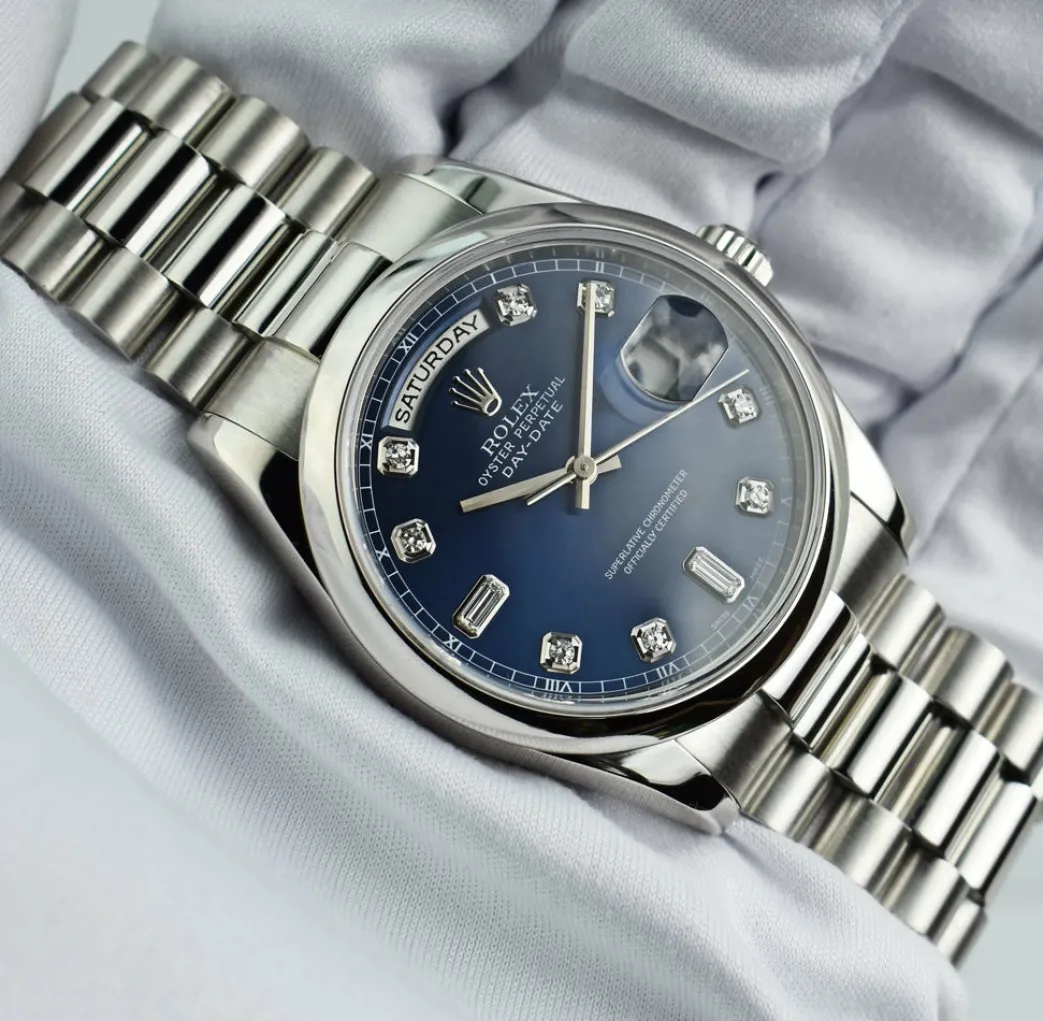 Absolutely Stunning brilliant Rolex Blue Diamond Dial! This is the 36mm size Platinum Rolex Day-Date President model 118206: This is the style with the Rolex Platinum bracelet. To replace this Rolex has an estimated MSRP of $60,600. This Rolex is in pristine condition…Priced to sell immediately!