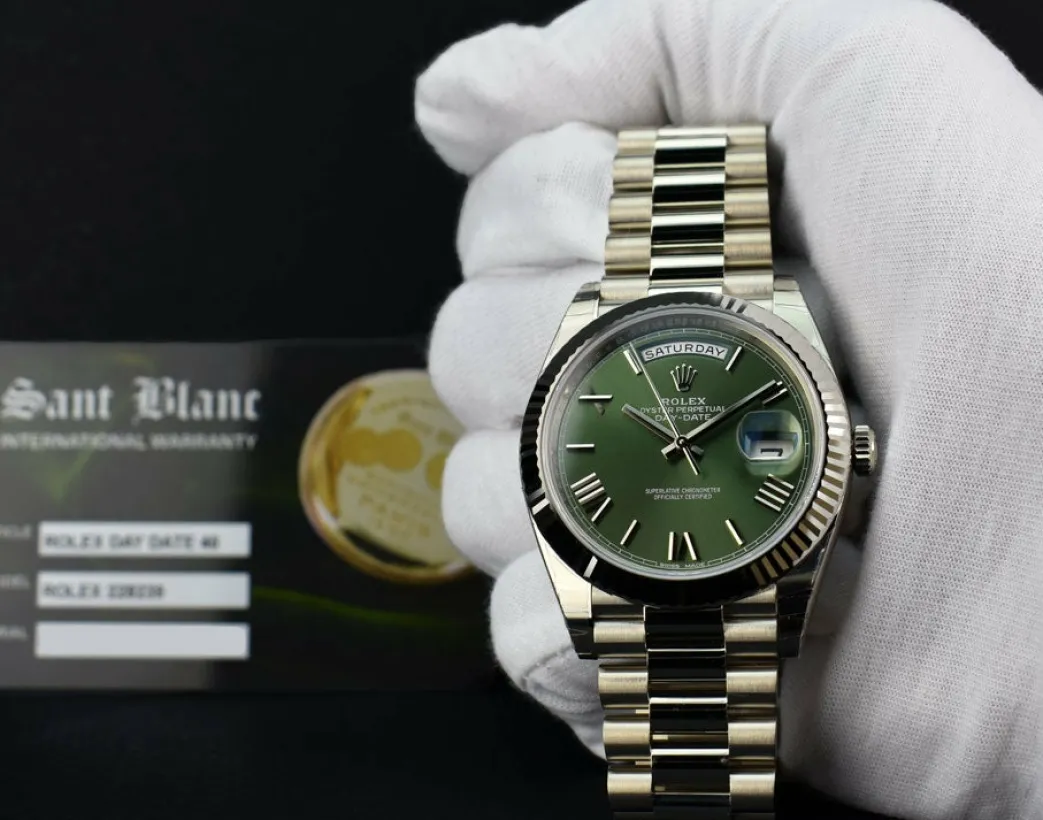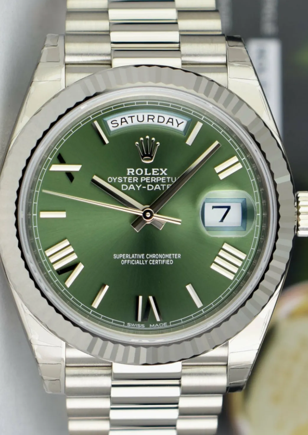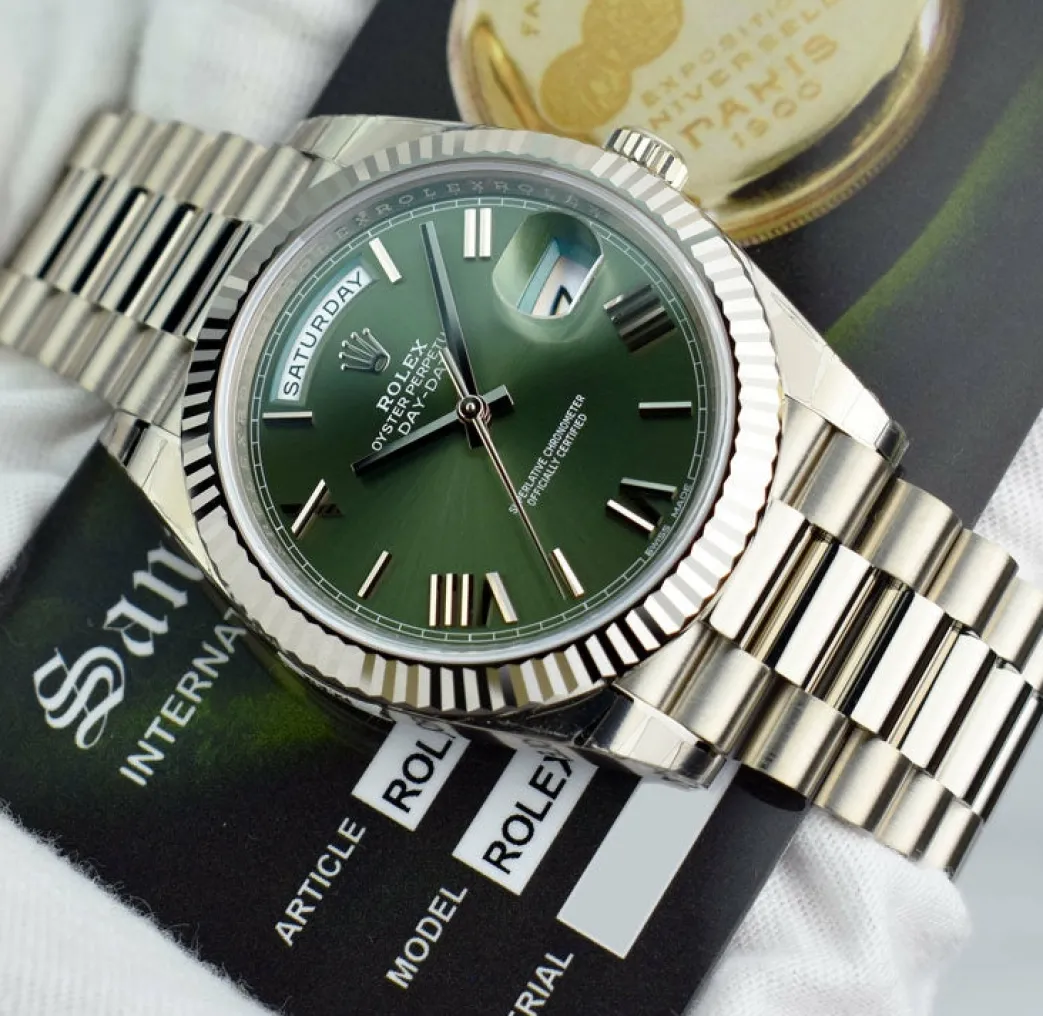 Rolex – Absolutely Stunning brilliant Rolex Green Roman Dial! This is the Rolex Day-Date 40mm size Day-Date President: This is the style with heavy genuine Rolex 18kt White Gold bracelet. This Rolex is in pristine condition…Priced to sell immediately!