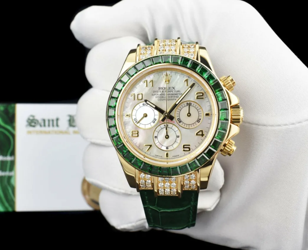 CUSTOM DAYTONA – Custom bezel & Custom Diamond End Links. Absolutely Stunning brilliant original Rolex Factory Mother of Pearl Arabic Dial! This is the 40mm size 18kt Yellow Gold Rolex Daytona model 16518: This is the style with Green Leather strap. This Rolex is in very good condition…Priced to sell immediately!
