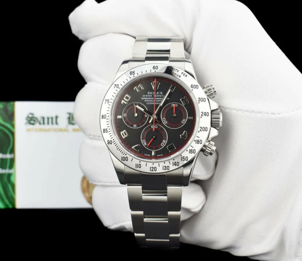 Absolutely Stunning brilliant Rolex Factory Black Arabic “Race” Dial! This is the 40mm size Stainless Steel Daytona model 116520: This is the style with the Rolex Stainless Steel bracelet. This Rolex is in pristine condition…Priced to sell immediately!