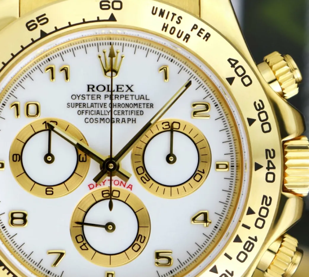 Absolutely Stunning brilliant Rolex White Arabic Dial! This is the 40mm size 18kt Gold Rolex Daytona model 116518: This is the style with the Rolex Crocodile Strap. This Rolex is in pristine condition…Priced to sell immediately!