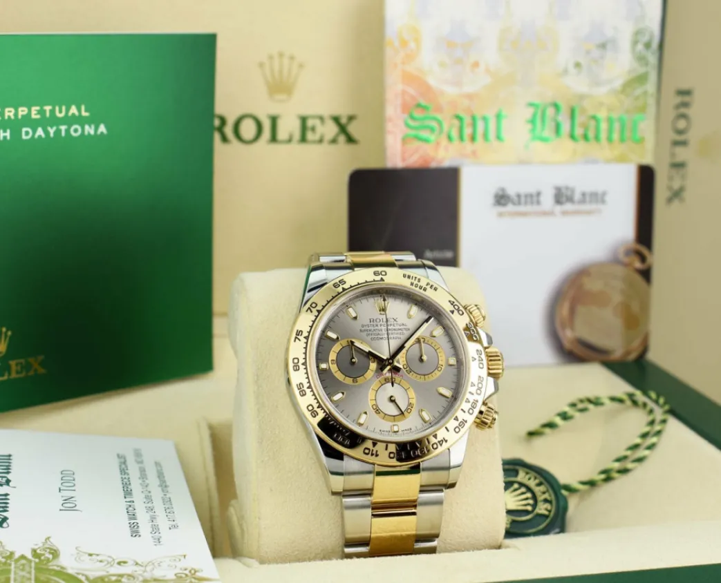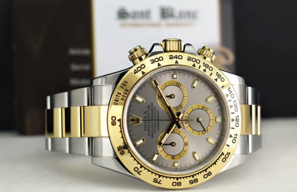 ROLEX FAT BUCKLE – This Daytona is a later model with Inner Bezel Engraving and the newer “Fat” clasp! Absolutely Stunning brilliant Rolex Factory Slate Index Dial! This is the 40mm size 18kt Gold & Stainless Steel Rolex Men’s Daytona – Rolex model 116503: This is the style with the Rolex 18kt Gold & Stainless bracelet. To replace this Rolex has an estimated MSRP of $17,400. This Rolex is in pristine condition…Priced to sell immediately!