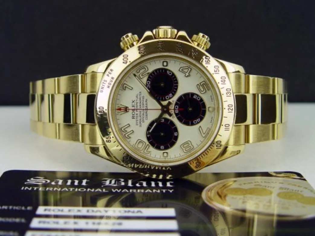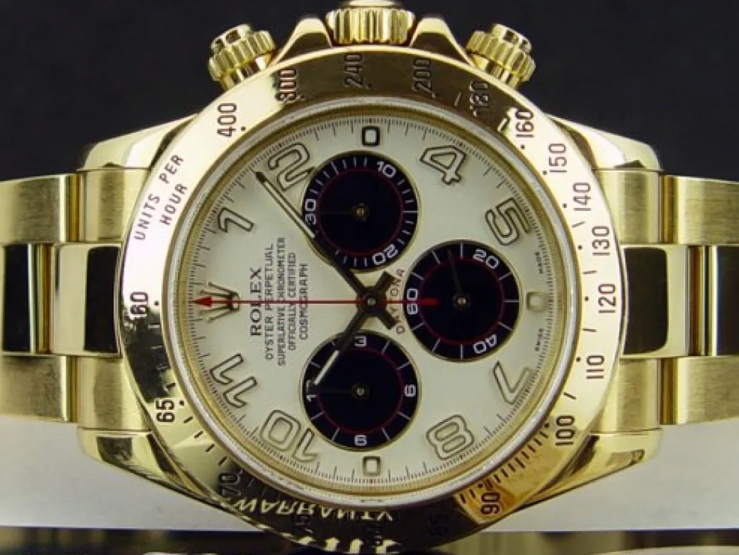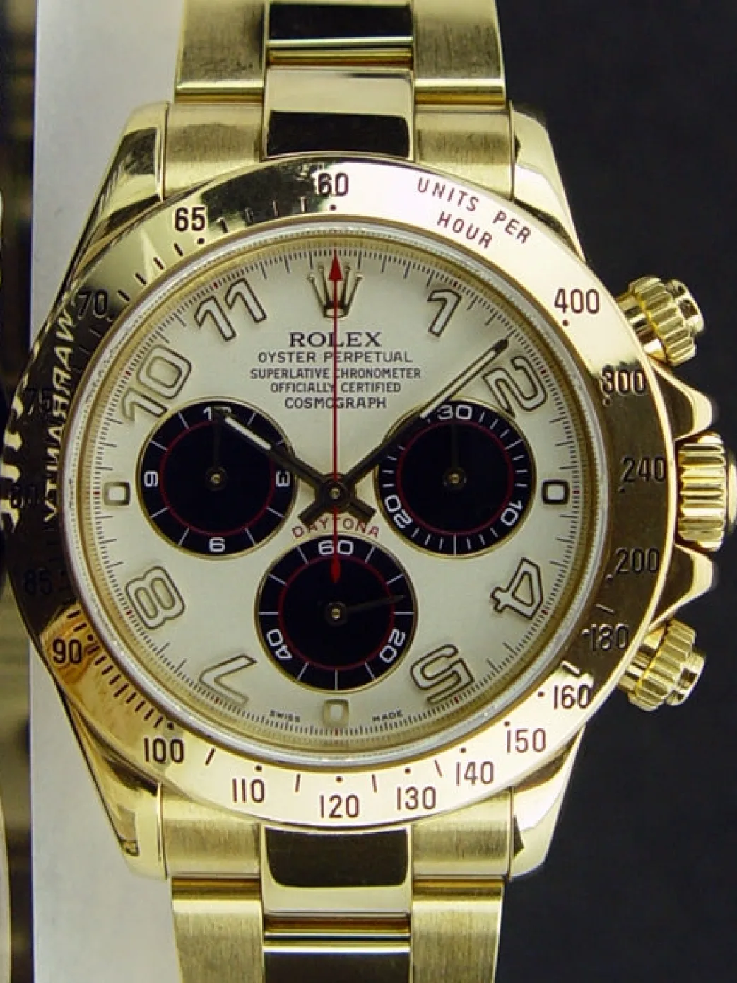 Absolutely Stunning brilliant Rolex White Arabic Dial with Black Sub dials! This is the 40mm size 18kt Yellow Gold Rolex Daytona model 116528: This is the newest style with the Rolex 18kt Gold bracelet. To replace this Rolex has an estimated MSRP of $34,650. This Rolex is in pristine condition…Priced to sell immediately!