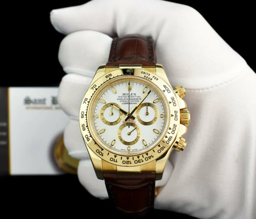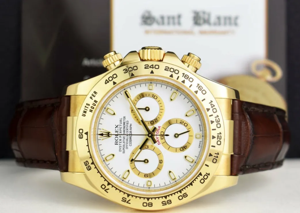 ROLEX REHAUT – This Daytona has Inner Bezel Engraving (Rehaut)! Absolutely Stunning brilliant Rolex Factory White Index Dial! This is the 40mm size 18kt Yellow Gold Rolex Daytona – Rolex model 116518: This is the style with Rolex Crocodile Strap. This Rolex is in pristine condition…Priced to sell immediately!