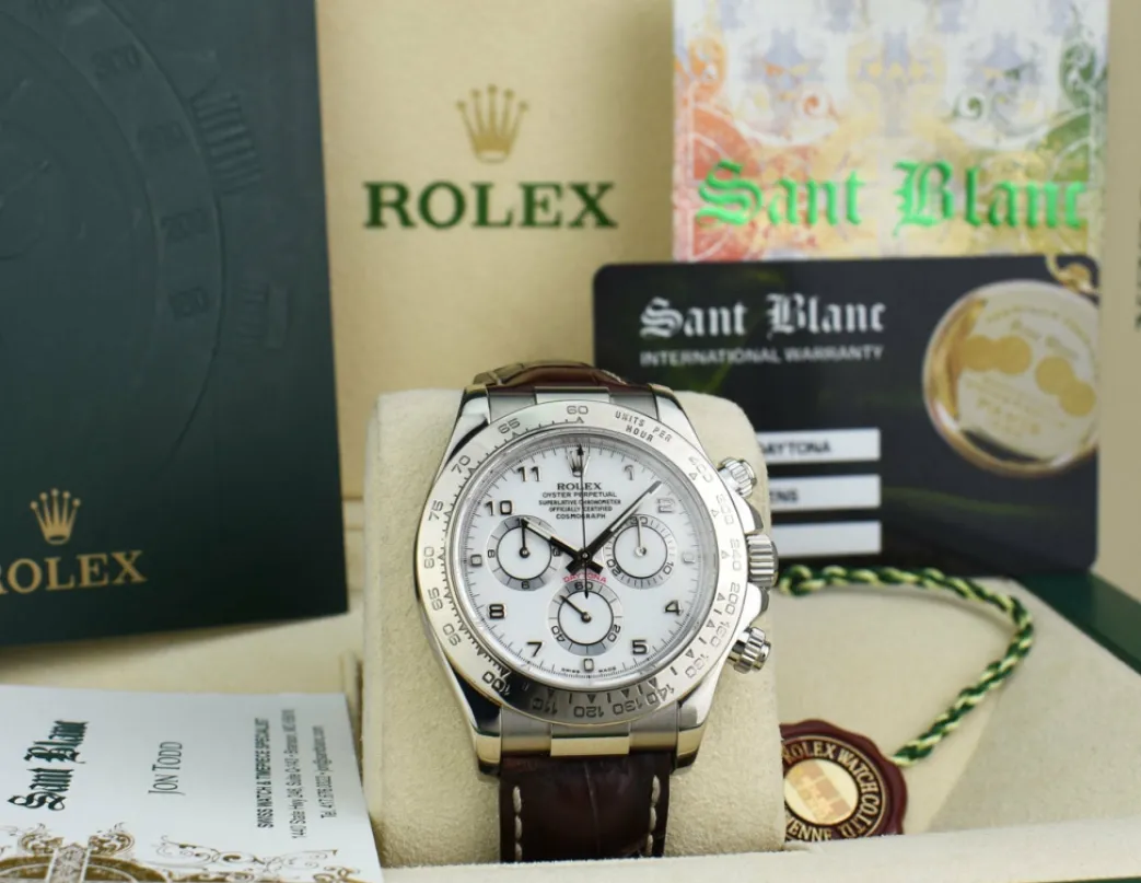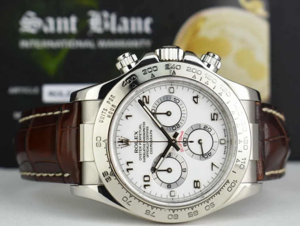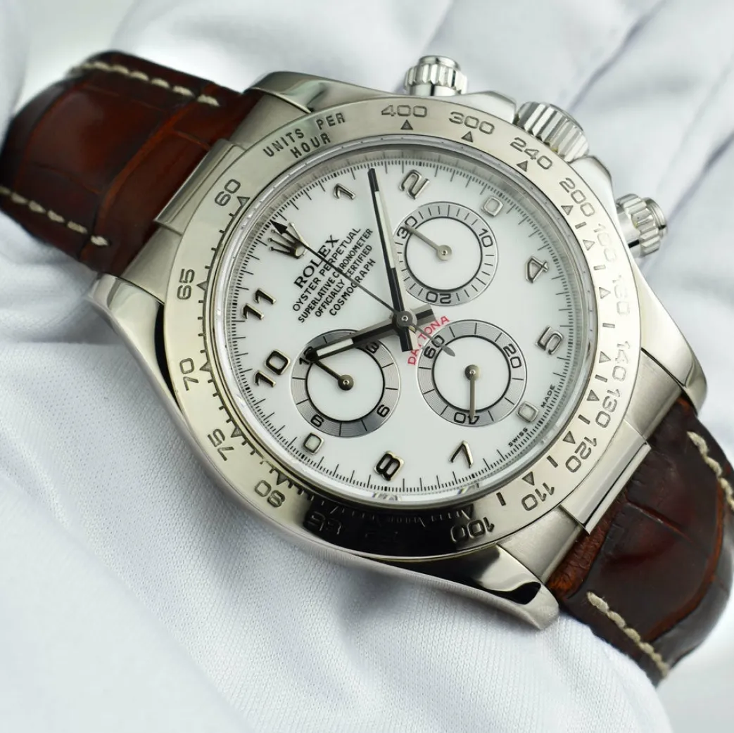 Absolutely Stunning brilliant Rolex Factory White Arabic Dial! This is the 40mm size Rolex Men’s 18kt White Gold Daytona – Rolex model 116519: This is the style with the Rolex Brown Crocodile Strap. This Rolex is in pristine condition…Priced to sell immediately!