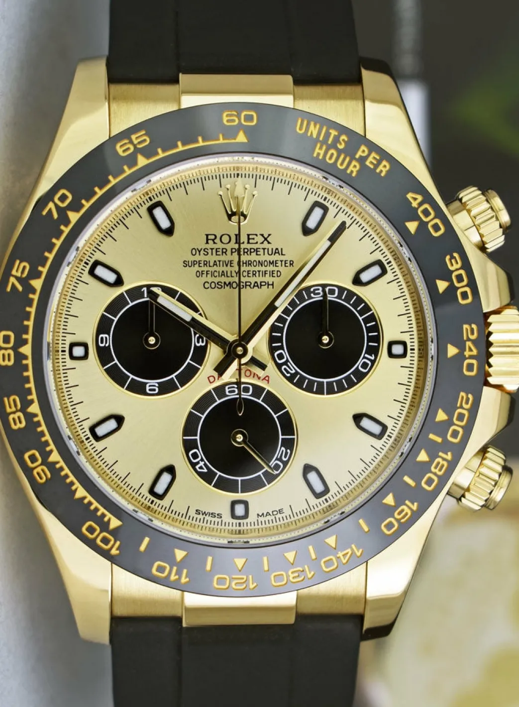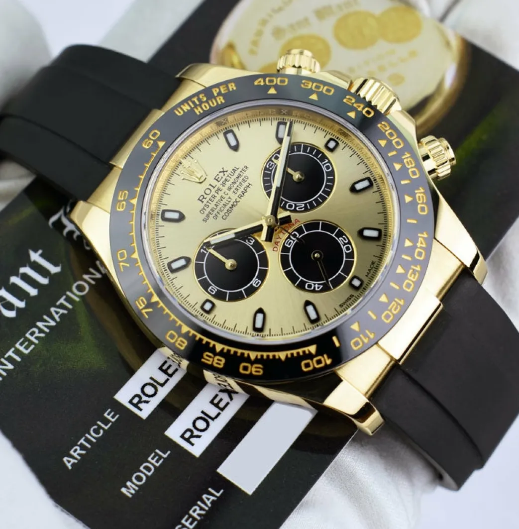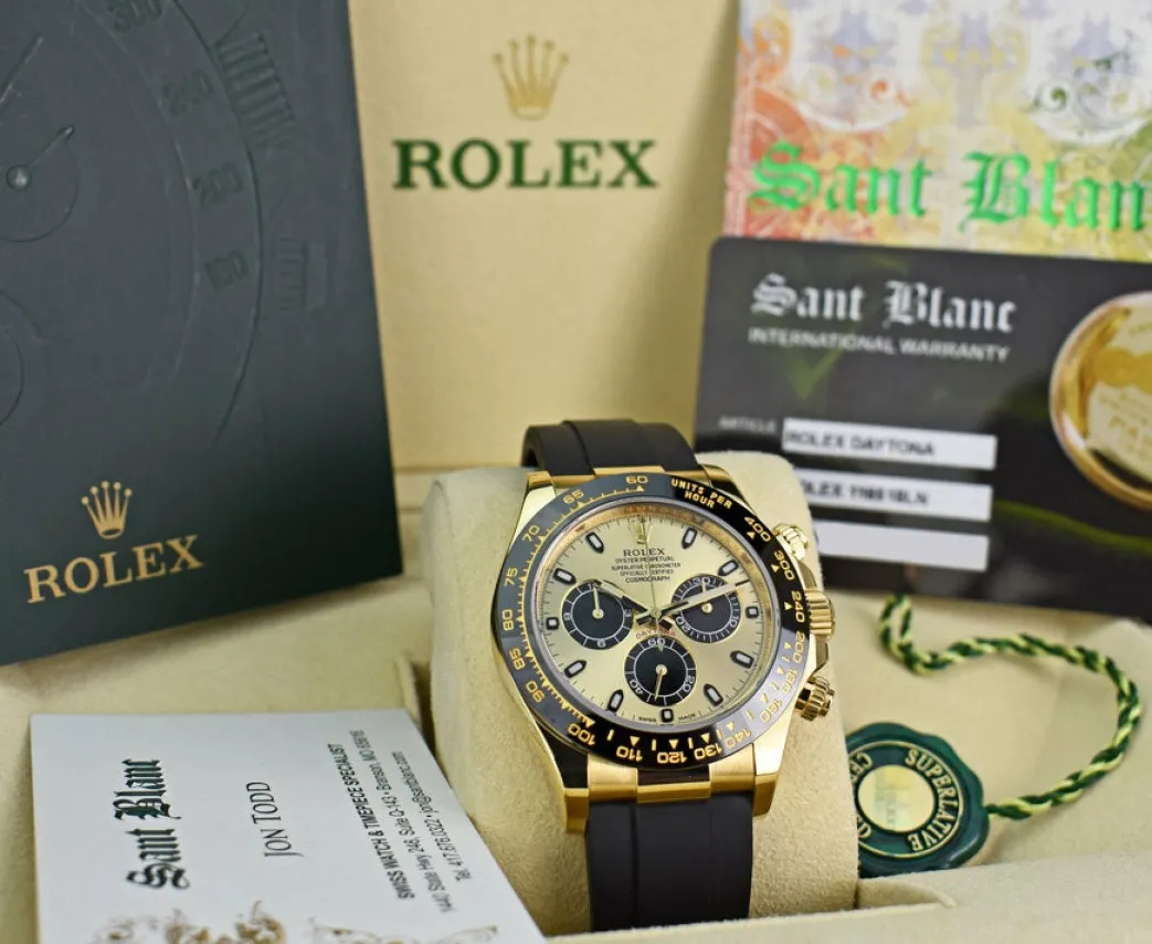 Absolutely Stunning brilliant Rolex Factory Champagne “Paul Newman” Index Dial! This is the 40mm size 18kt Gold Rolex Daytona model 116518LN: This is the style with the Rolex Rubber Oysterflex Strap. This Rolex is in pristine condition…Priced to sell immediately!