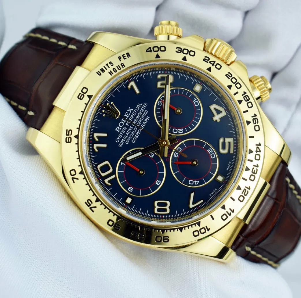 ROLEX REHAUT – This Daytona is a later model with inner bezel engraving! Absolutely Stunning brilliant Rolex Factory Blue Arabic Dial! This is the Rolex Men’s Daytona – Rolex model 116518 40mm size 18kt Gold Daytona: This is the style with Rolex Crocodile Strap Rolex genuine. This Rolex is in pristine condition…Priced to sell immediately!