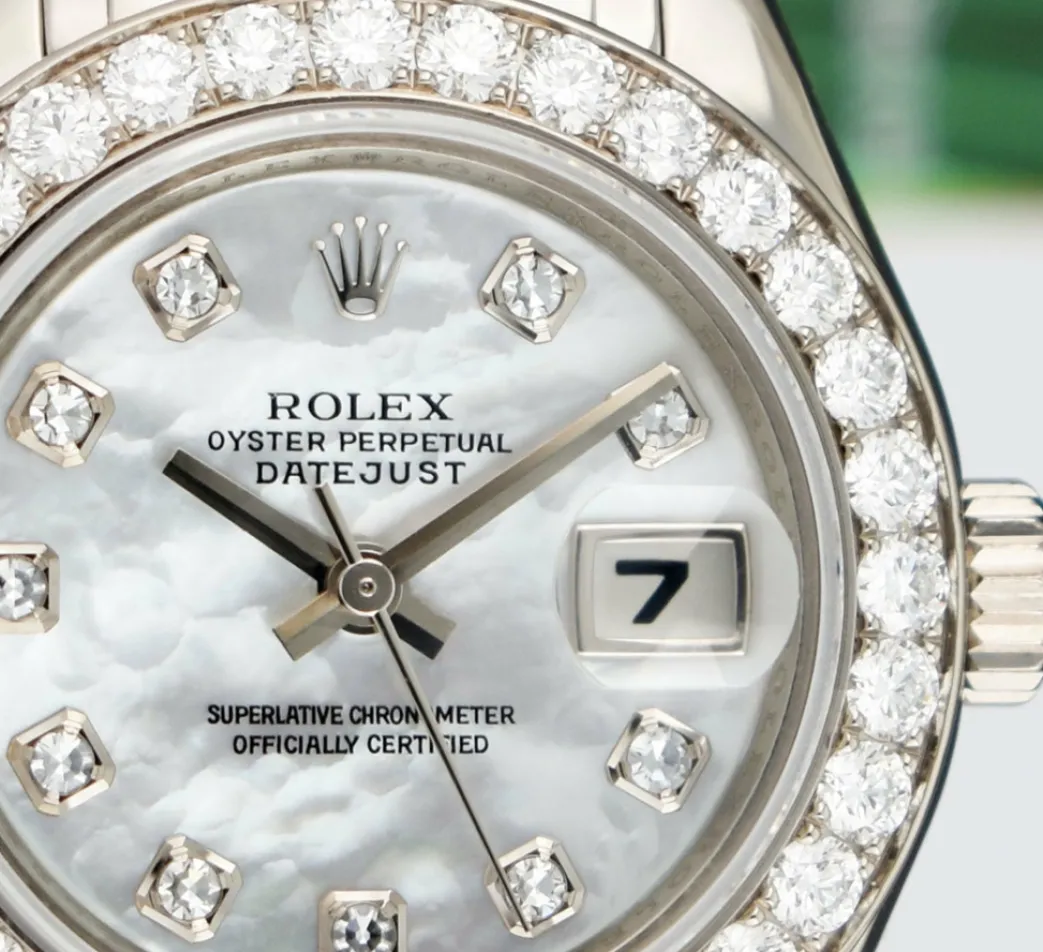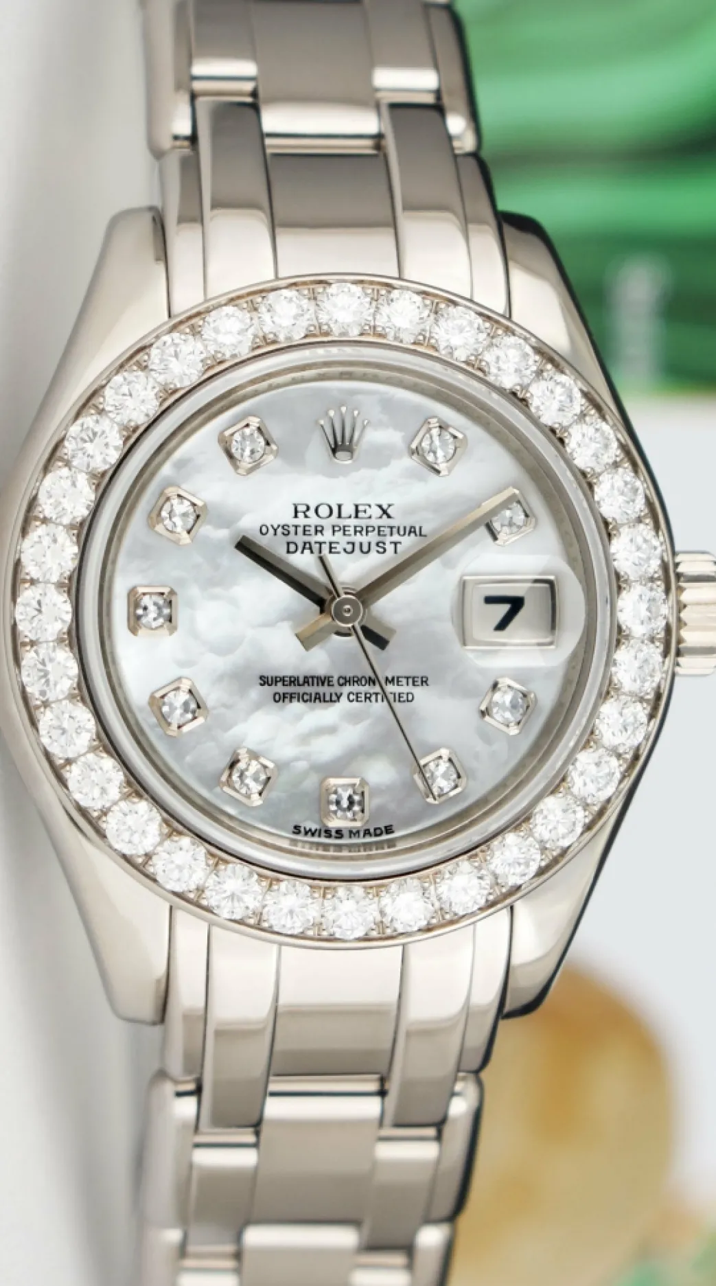 ROLEX REHAUT – This Pearlmaster is a later model with Inner Bezel Engraving (Rehaut)! Absolutely Stunning brilliant Rolex Mother of Pearl Diamond Dial! This is the 29mm size 18kt White Gold Rolex Ladies Datejust Pearlmaster model 80299: This is the style with the Rolex 18kt White Gold bracelet. This Rolex is in pristine condition…Priced to sell immediately!