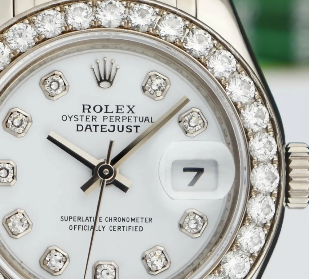 ROLEX REHAUT – This Pearlmaster is a later model with Inner Bezel Engraving (Rehaut)! Absolutely Stunning brilliant Rolex White Diamond Dial! This is the 29mm size 18kt White Gold Rolex Ladies Datejust Pearlmaster model 80299: This is the style with the Rolex 18kt White Gold bracelet. This Rolex is in pristine condition…Priced to sell immediately!