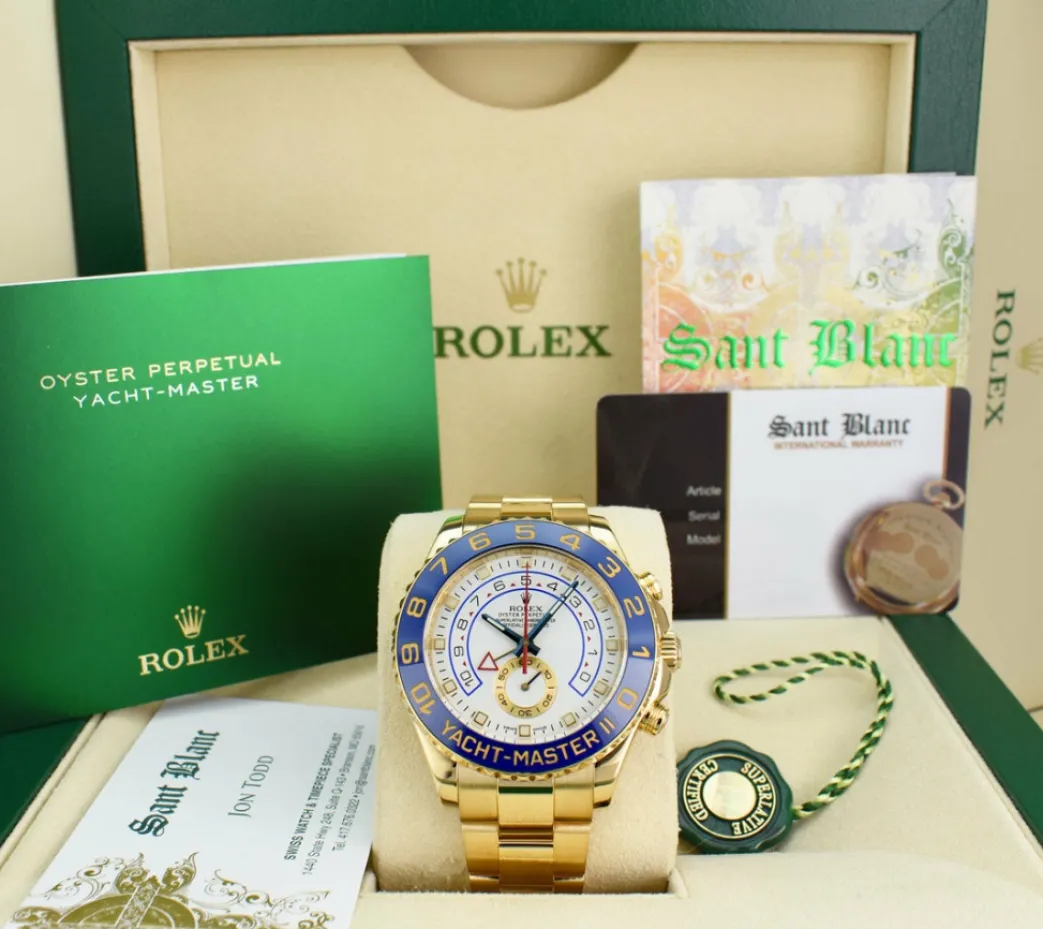 Absolutely stunning brilliant Rolex White Index Dial! This is the 44mm size 18kt Gold Rolex Yachtmaster II model 116688: This is the style with the Rolex 18kt Gold bracelet. To replace this Rolex has an estimated MSRP of $44,550. This Rolex is in pristine condition…Priced to sell immediately!