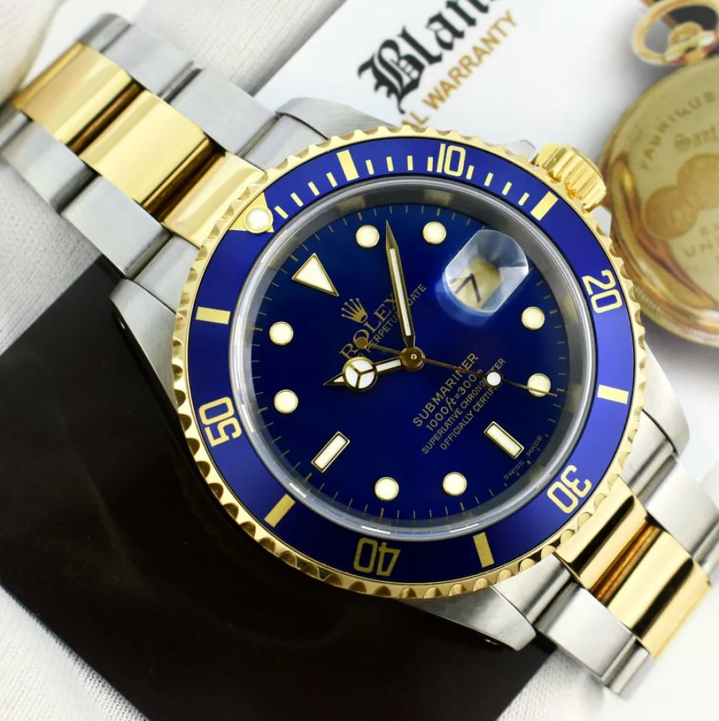 ROLEX BOX BOOKS & PAPERS – Comes with Original Rolex Box, Books, & Factory Rolex Papers! Absolutely Stunning brilliant Rolex Blue Index Dial! This is the 40mm size 18kt Yellow Gold & Stainless Steel Rolex Submariner model 16613: This is the style with the Rolex 18kt Gold & Stainless bracelet. This Rolex is in pristine condition…Priced to sell immediately!
