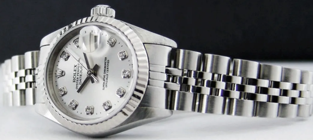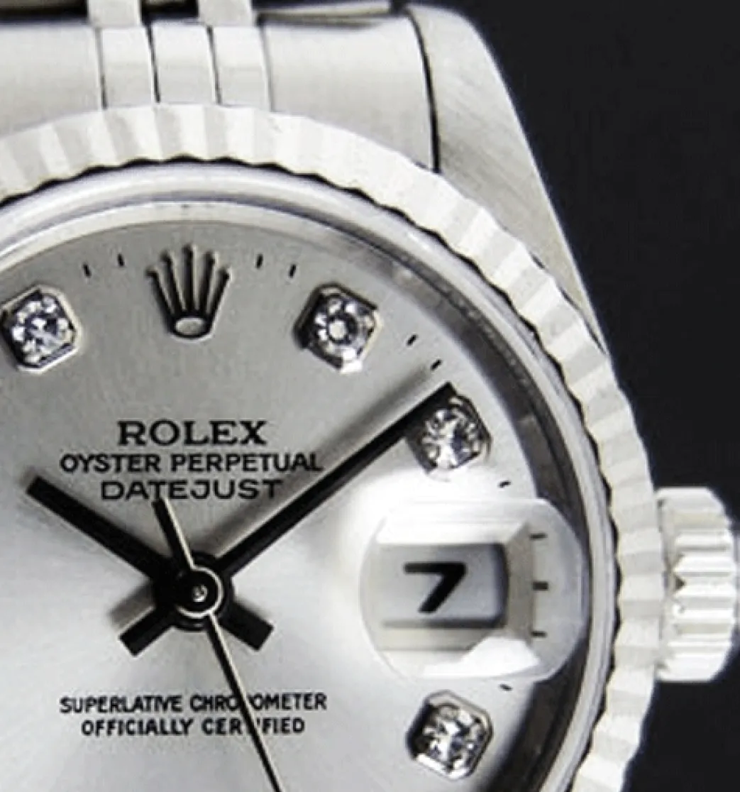 Absolutely Stunning brilliant Rolex Silver Diamond Dial! This is the Rolex Datejust model 69174 Ladies 26mm size Datejust: This is the style with Rolex Stainless bracelet. To replace this Rolex has an estimated MSRP of $9,100. This Rolex is in pristine condition…Priced to sell immediately!