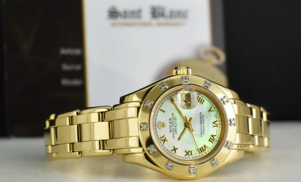 Absolutely Stunning brilliant Rolex Mother of Pearl Roman Dial! This is the 29mm size 18kt Yellow Gold Rolex Ladies Datejust Pearlmaster – Rolex model 69318: This is the style with the Rolex 18kt Gold bracelet. This Rolex is in pristine condition…Priced to sell immediately!