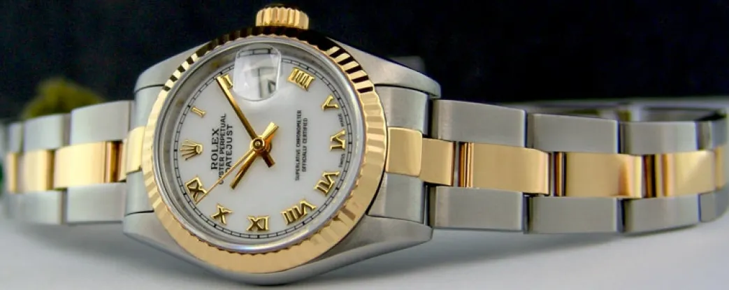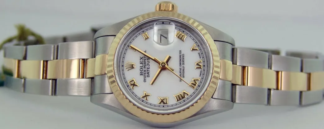 Absolutely Stunning brilliant Rolex White Roman Dial! This is the Ladies 26mm size 18kt Gold & Stainless Steel Rolex Datejust model 79173: This is the style with the Rolex 18kt Gold & Stainless Steel bracelet. This Rolex is in pristine condition…Priced to sell immediately!