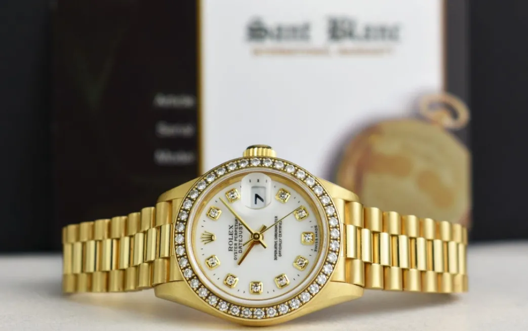 Absolutely Stunning brilliant Rolex White Diamond Dial and Factory Diamond Bezel! This is the 26mm size 18kt Yellow Gold Rolex Ladies Datejust President model 69178: This is the style with the Rolex 18kt Gold bracelet. To replace this Rolex has an estimated MSRP of $38,750. This Rolex is in pristine condition…Priced to sell immediately!
