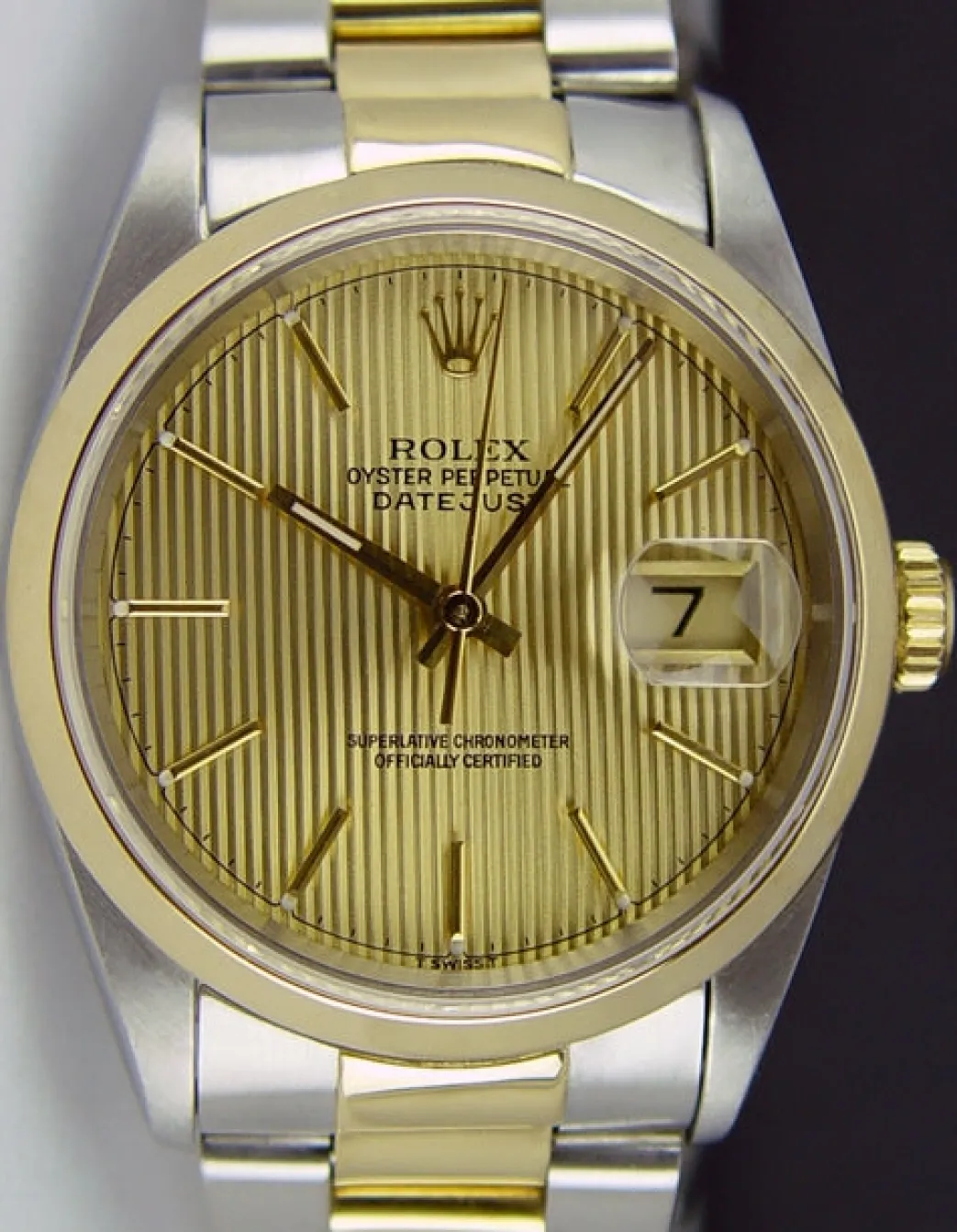 Absolutely Stunning brilliant Rolex Champagne Tapestry Stick Dial! This is the 36mm size 18kt Yellow Gold & Stainless Steel Rolex Datejust model 16203: This is the style with the Rolex 18kt Gold & Stainless bracelet. To replace this Rolex has an estimated MSRP of $10,300. This Rolex is in pristine condition…Priced to sell immediately!
