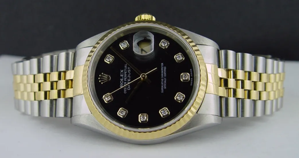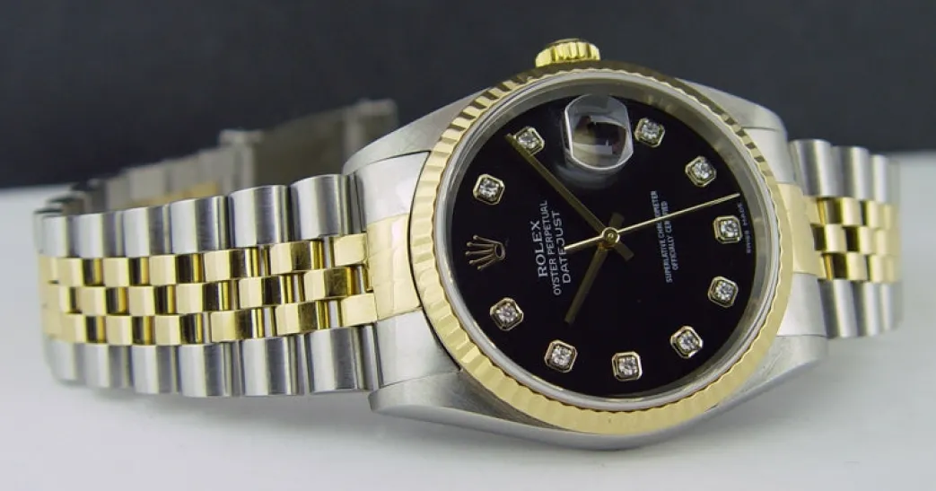 Absolutely Stunning brilliant Rolex Black Diamond Dial! This is the 36mm size 18kt Yellow Gold & Stainless Steel Rolex Datejust model 16233: This is the style with the Rolex 18kt Gold & Stainless bracelet. To replace this Rolex has an estimated MSRP of $13,650. This Rolex is in pristine condition…Priced to sell immediately!