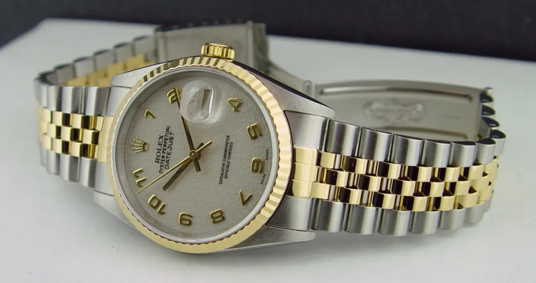 Absolutely Stunning brilliant Rolex Ivory Jubilee Arabic Dial! This is the 36mm size 18kt Yellow Gold & Stainless Steel Rolex Datejust model 16233: This is the style with the Rolex 18kt Gold & Stainless bracelet. To replace this Rolex has an estimated MSRP of $11,800. This Rolex is in pristine condition…Priced to sell immediately!