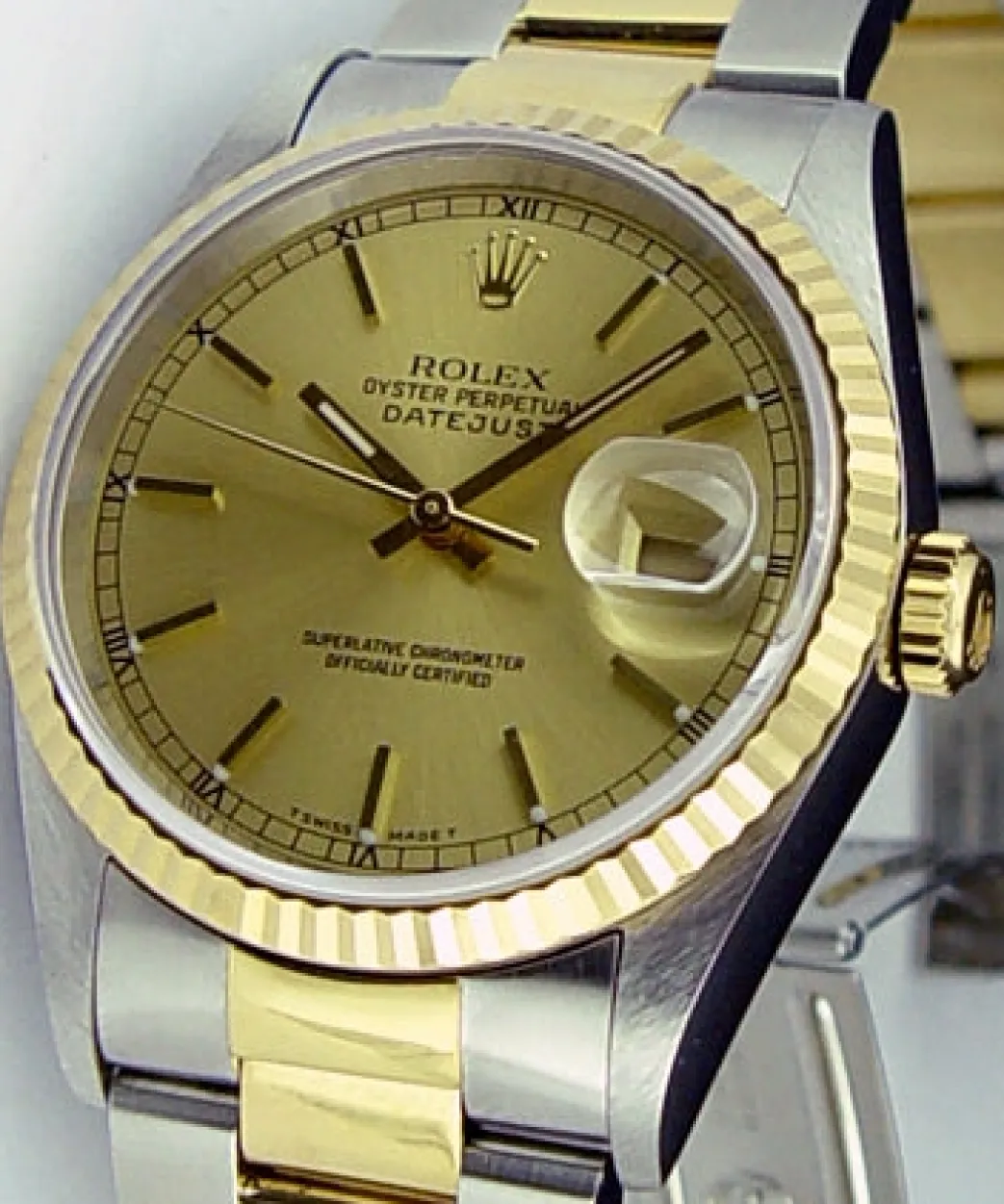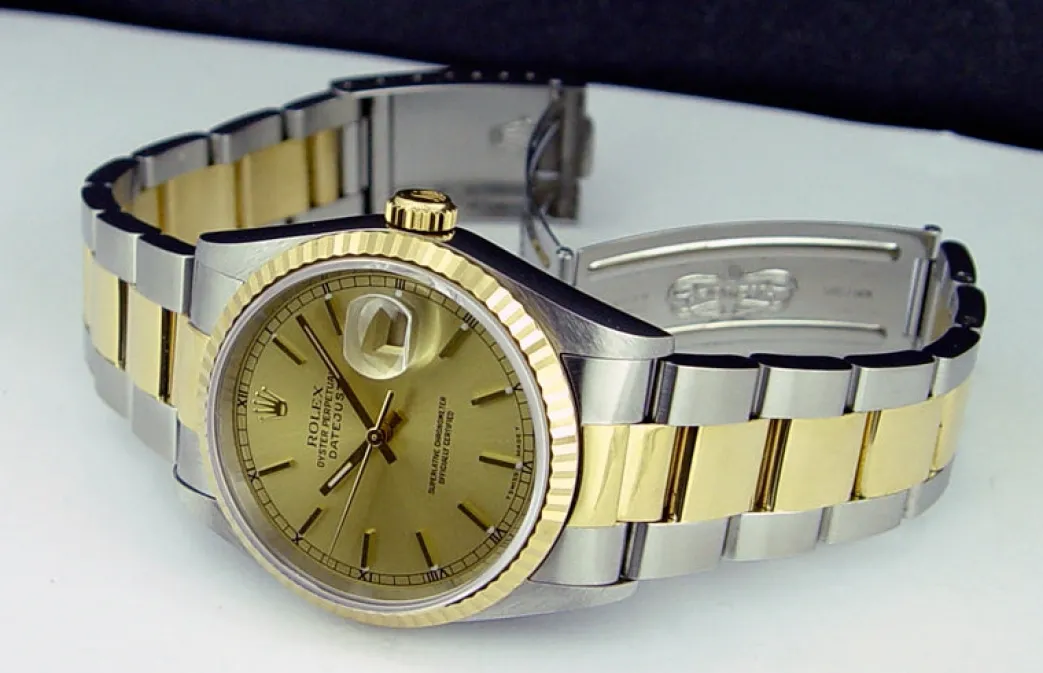 Absolutely Stunning brilliant Rolex Champagne Stick Dial! This is the 36mm size 18kt Gold & Stainless Steel Rolex Datejust model 16233: This is the style with the Rolex 18kt Gold & Stainless bracelet. To replace this Rolex has an estimated MSRP of $11,050. This Rolex is in pristine condition…Priced to sell immediately!