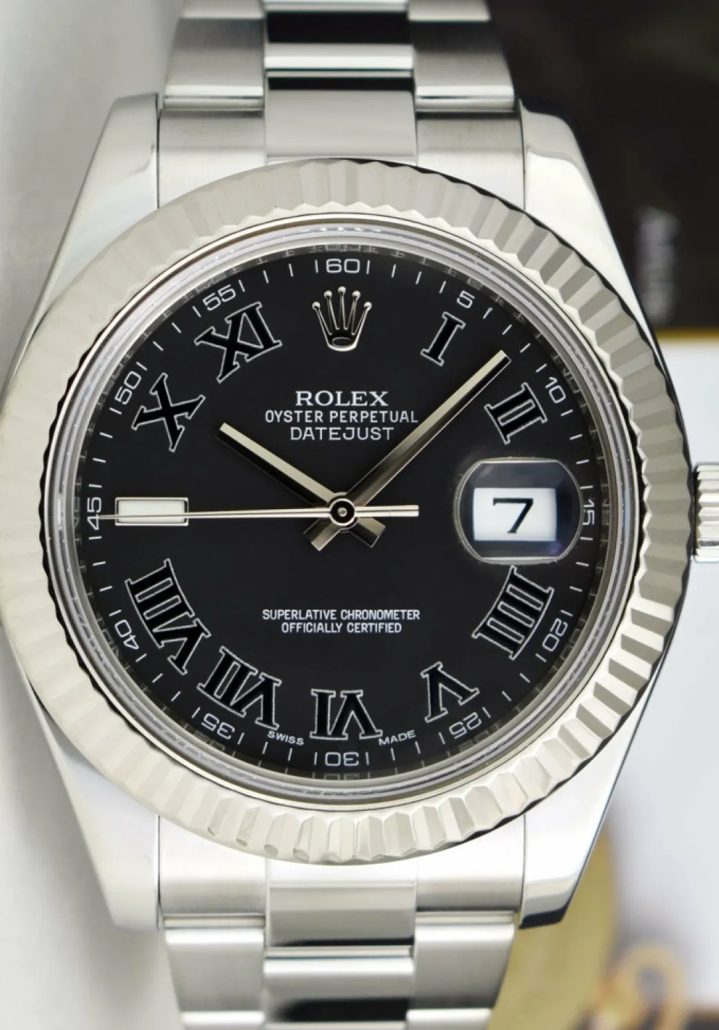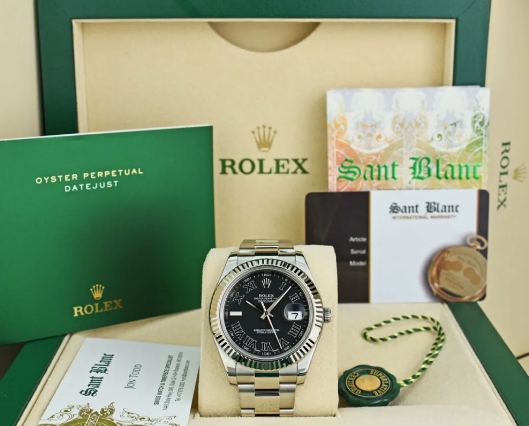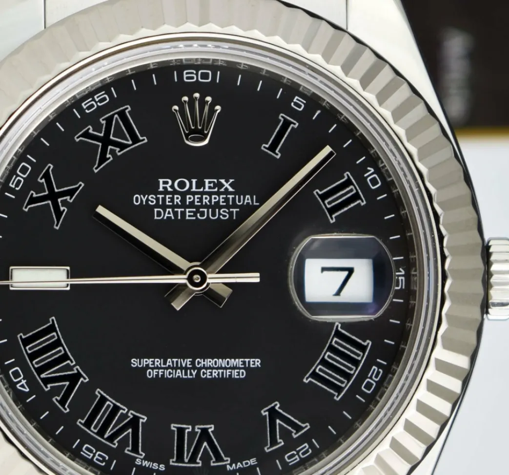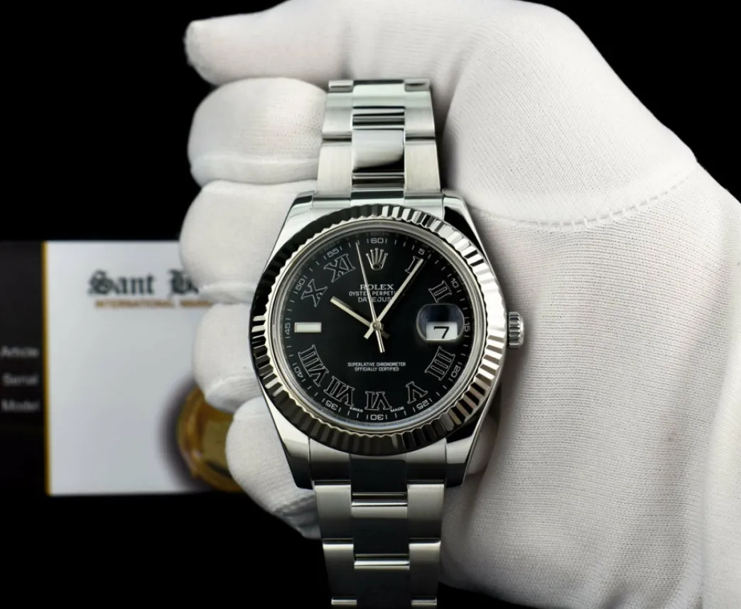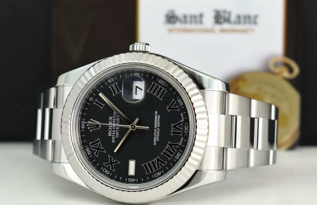 Absolutely Stunning brilliant Rolex Black Roman Dial! This is the 41mm size 18kt White Gold & Stainless Steel Rolex Datejust II model 116334: This is the style with the Rolex Stainless Steel Oyster bracelet. This Rolex is in pristine condition…Priced to sell immediately!