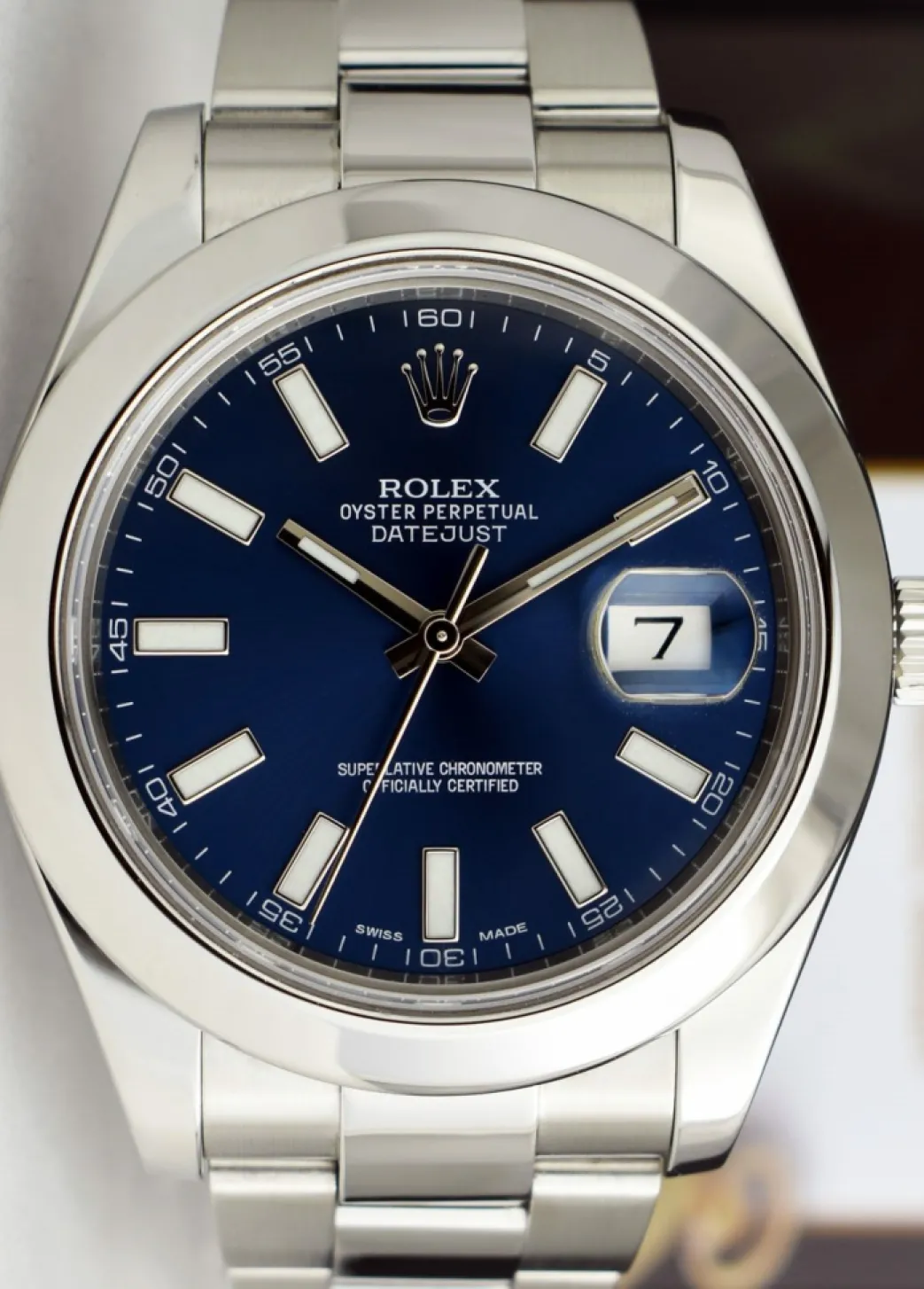 Absolutely Stunning brilliant Rolex Blue Index Dial! This is the 41mm size Stainless Steel Rolex Datejust II model 116300: This is the style with the Rolex Stainless Steel Oyster bracelet. This Rolex is in pristine condition…Priced to sell immediately!